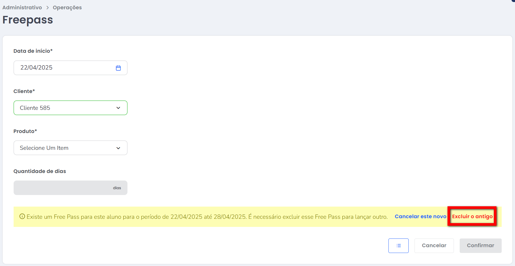 - Cancelar este novo: ao escolher essa opção, o sistema irá cancelar o FreePass recém-lançado, mantendo o antigo ativo;