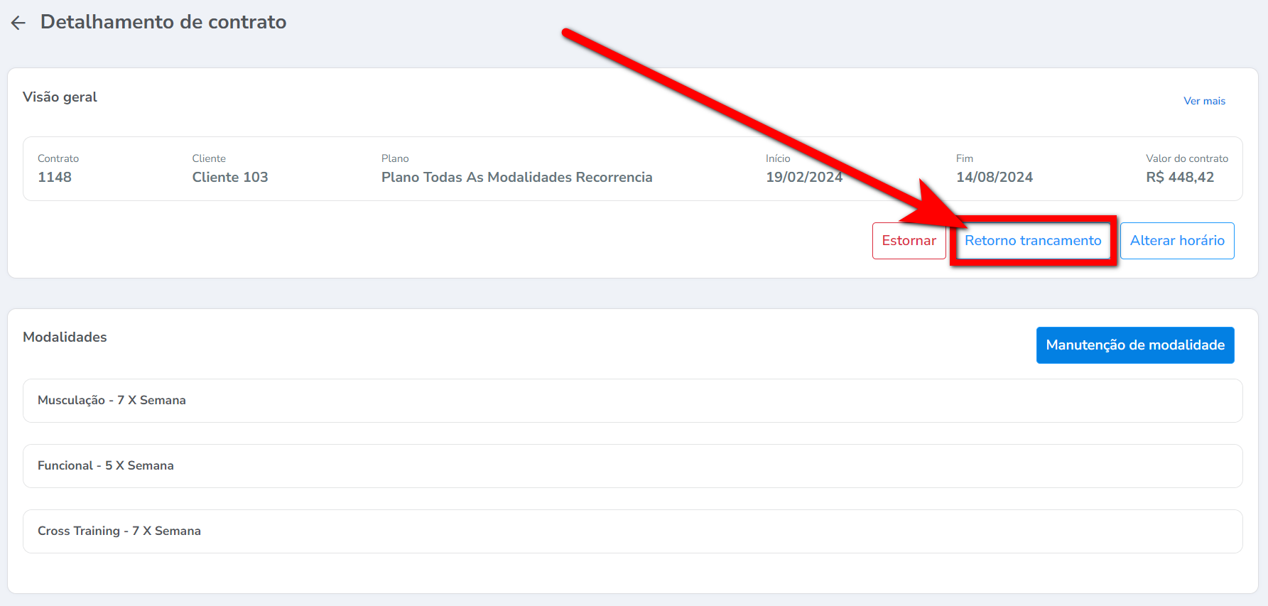1. Ao acessar o perfil do aluno, na guia “Contratos” localize e clique sobre o plano que deseja retornar do trancamento;