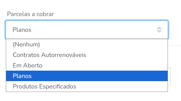 Recomendamos que, nesse caso, no momento do cadastro da autorização no sistema, no campo “Parcelas a cobrar”, seja selecionada a opção “Planos”. Dessa forma, o sistema cobrará automaticamente via Pix apenas as parcelas referentes aos planos contratados.