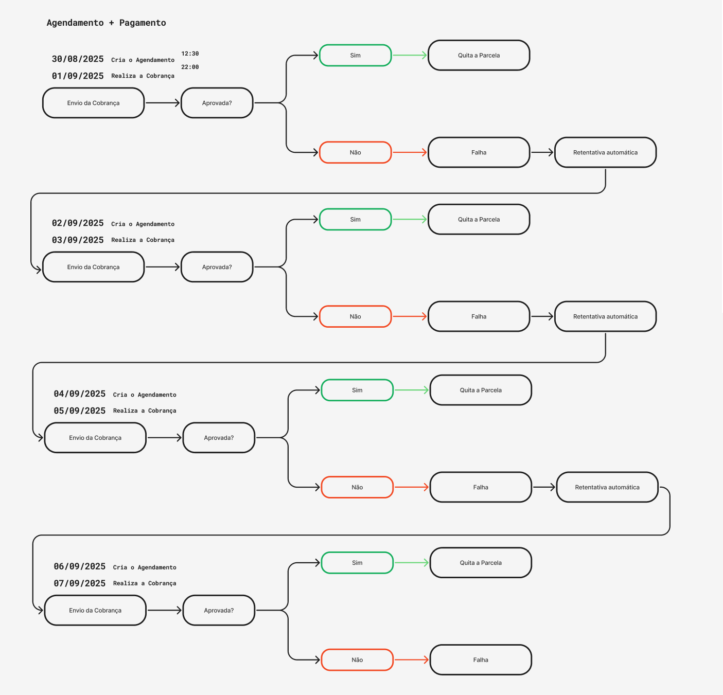 Caso a cobrança no dia 08 também não seja realizada, o sistema agendará uma última tentativa para o dia 10, contabilizando a terceira retentativa.