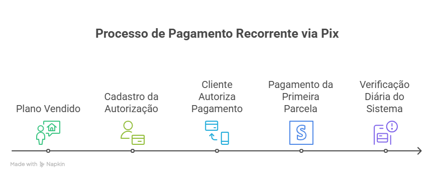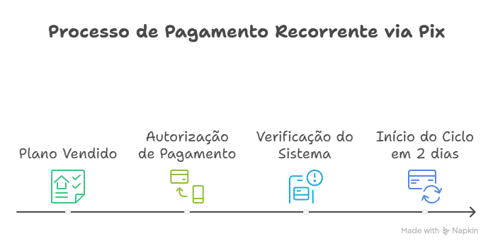 Neste exemplo, o plano foi vendido e a autorização de cobrança via Pix foi cadastrada. Dois dias após essa autorização, o sistema começará a rodar diariamente, verificando se existem parcelas vencidas ou com vencimento previsto para dali a dois dias, respeitando o limite configurado.