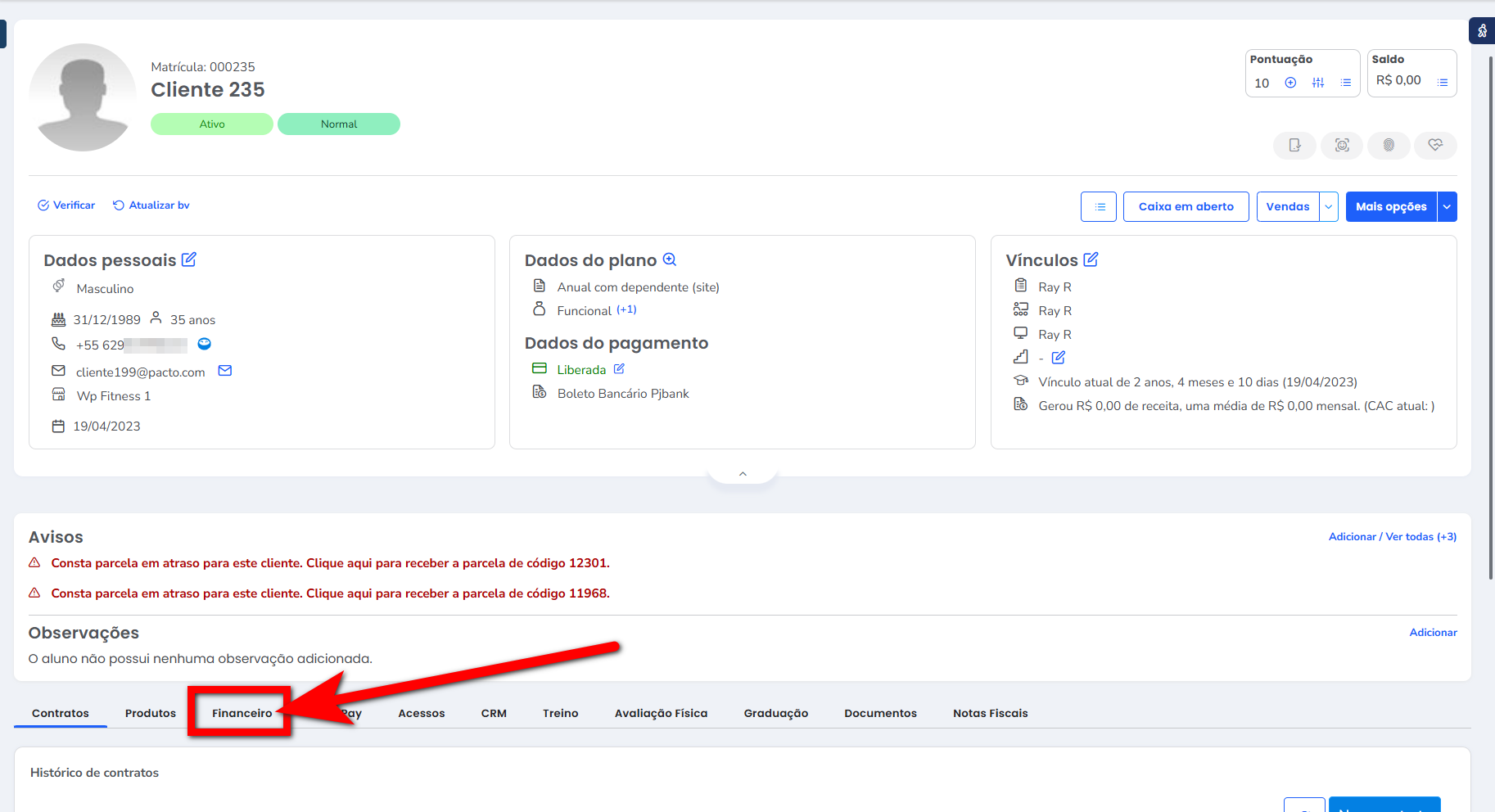 1. No módulo ADM, acesse o perfil do aluno e clique na aba “Financeiro”;
