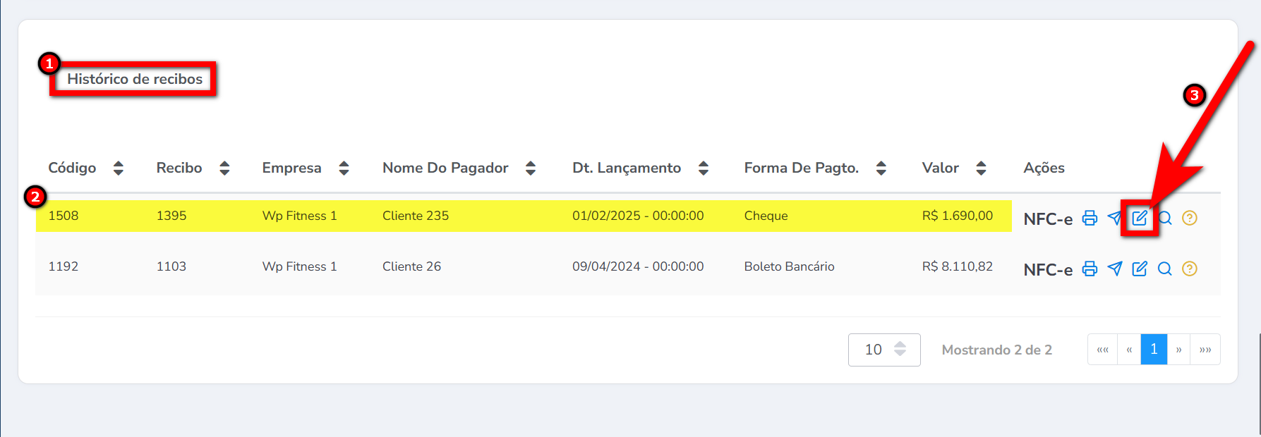2. Em “Histórico de recibos” identifique o recibo que contém o cheque que voltou do banco e clique no ícone