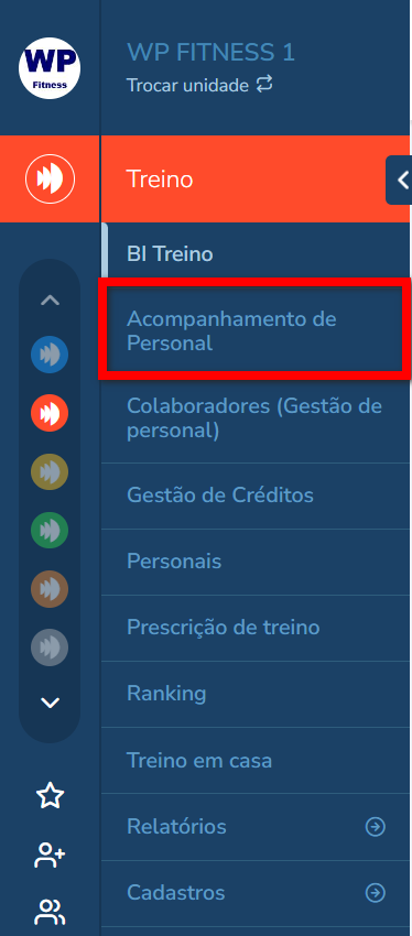 1. Acesse o módulo Treino, e no menu lateral esquerdo clique em “Acompanhamento de Personal“;