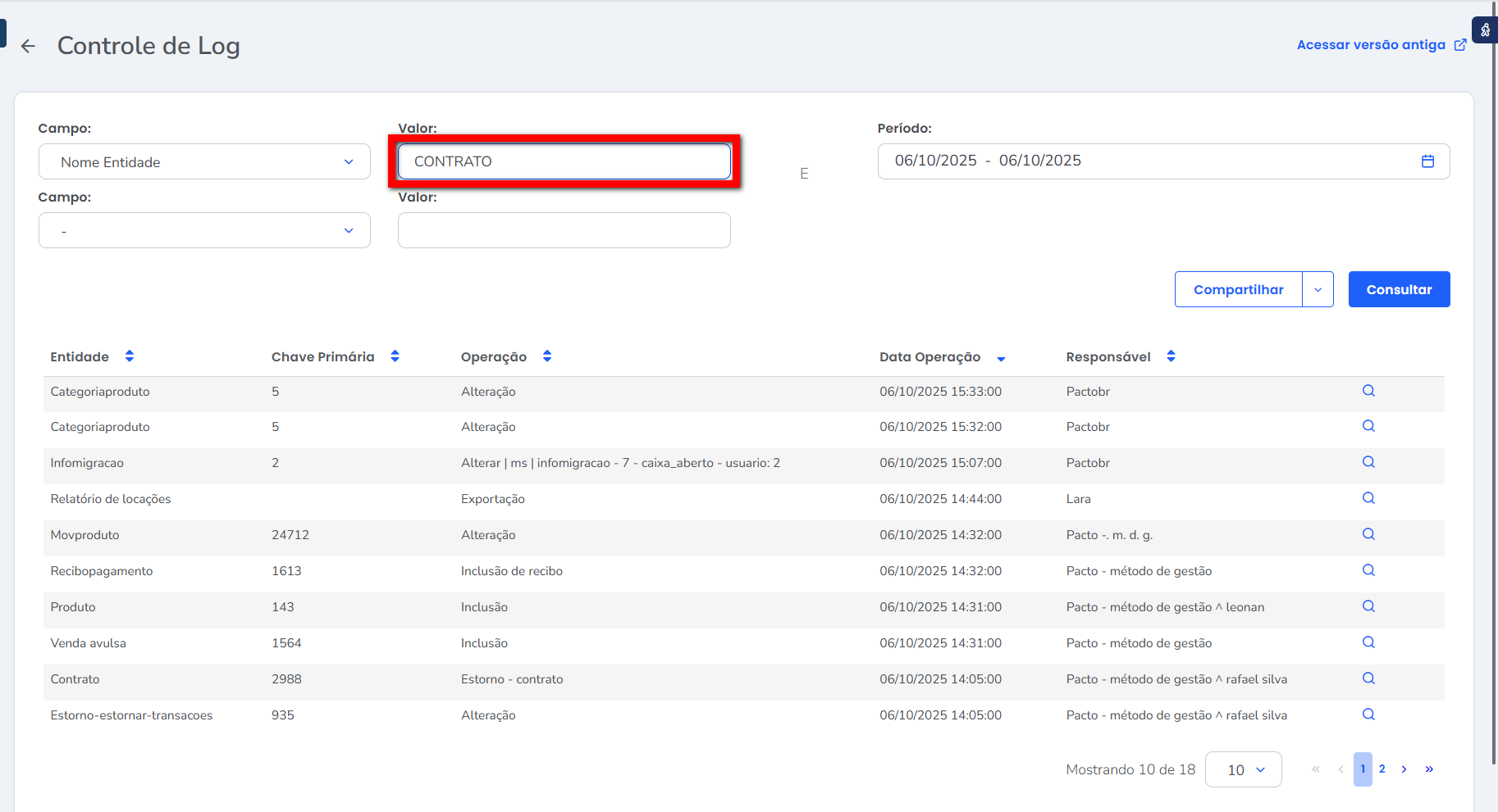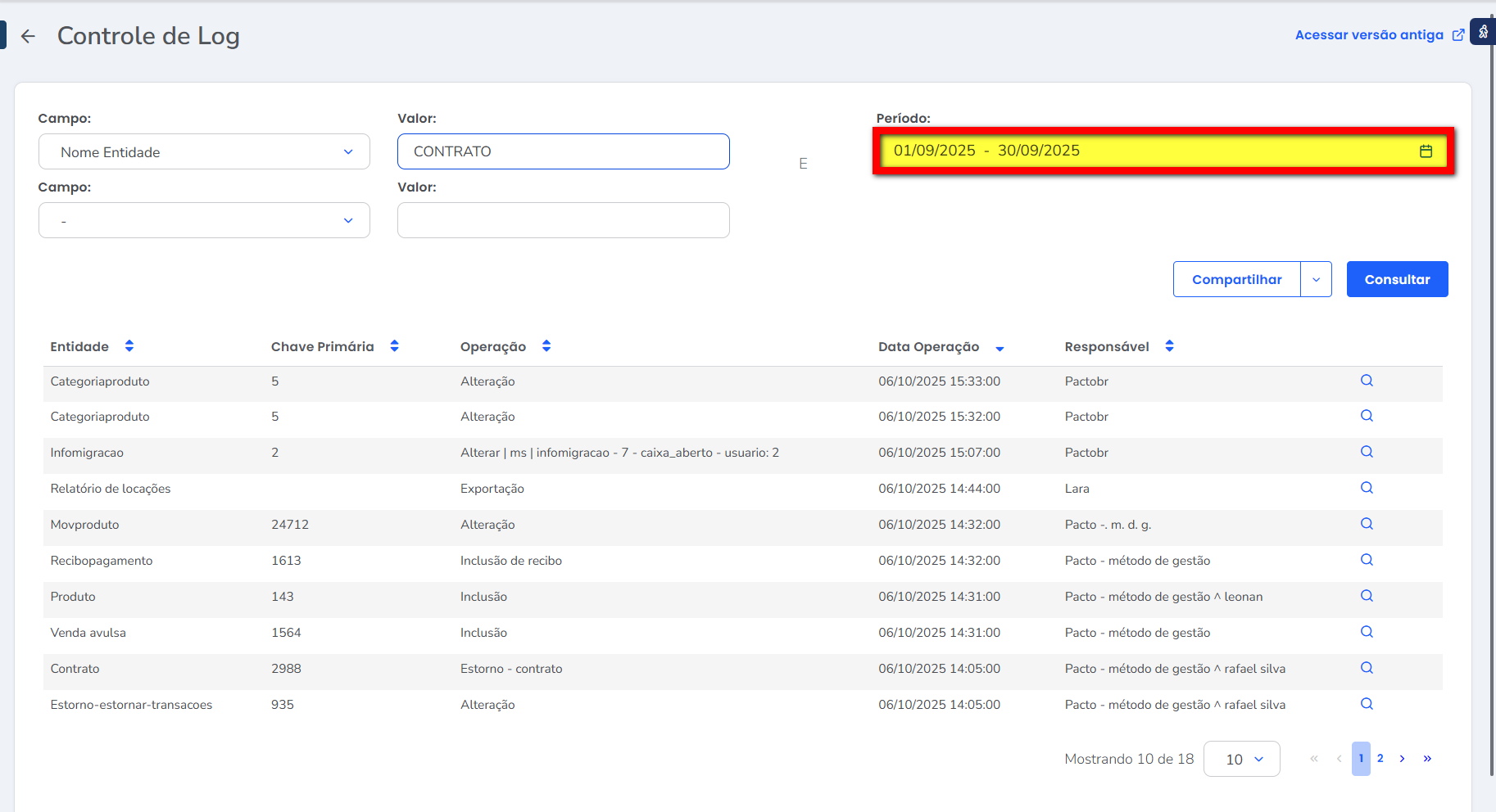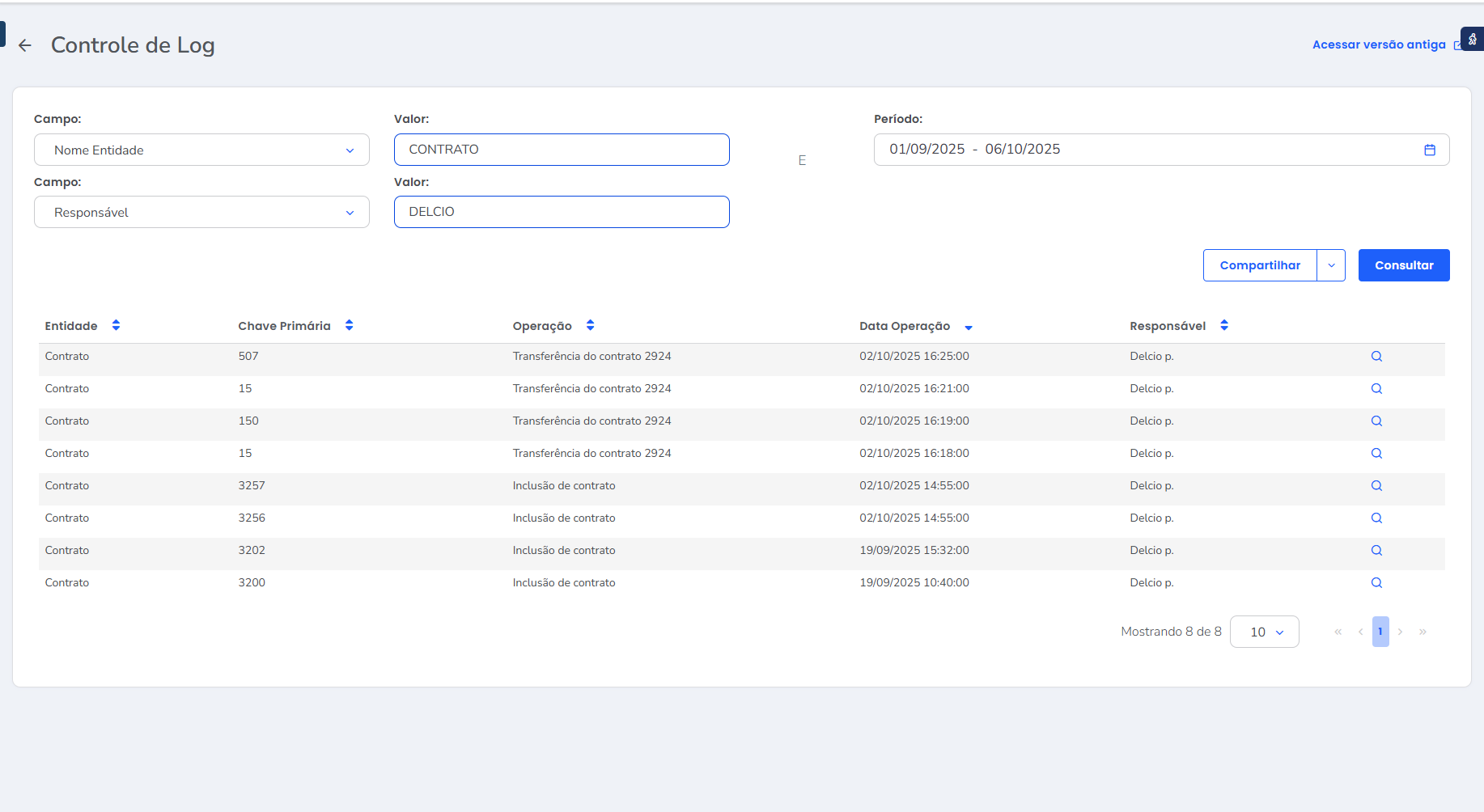 • Responsável: nesta coluna será apresentado o nome do usuário responsável que realizou a operação.