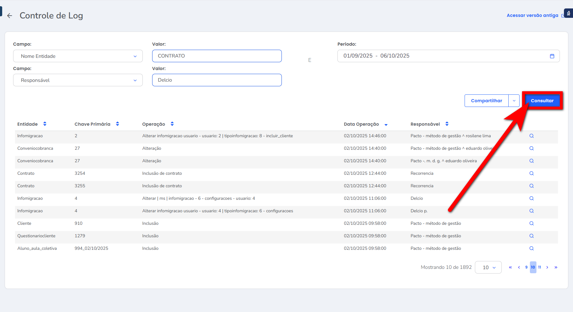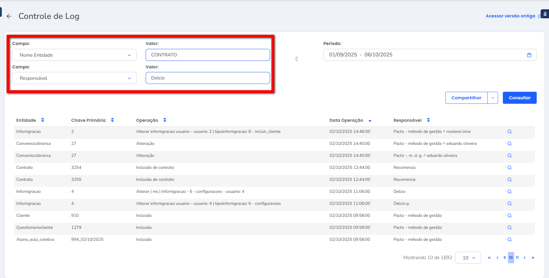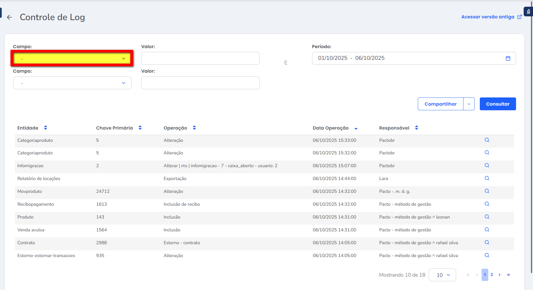 • Responsável: nesta coluna será apresentado o nome do usuário responsável que realizou a operação.