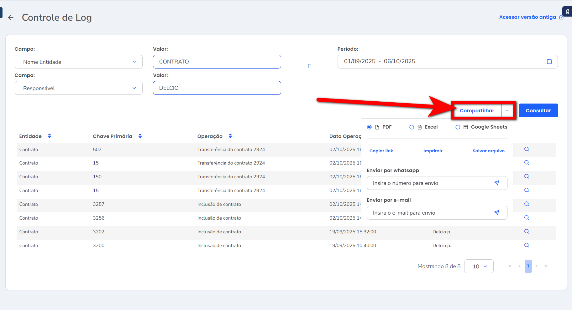 1. Consegue exportar a listagem para Excel ou PDF, clicando em “Compartilhar“.
