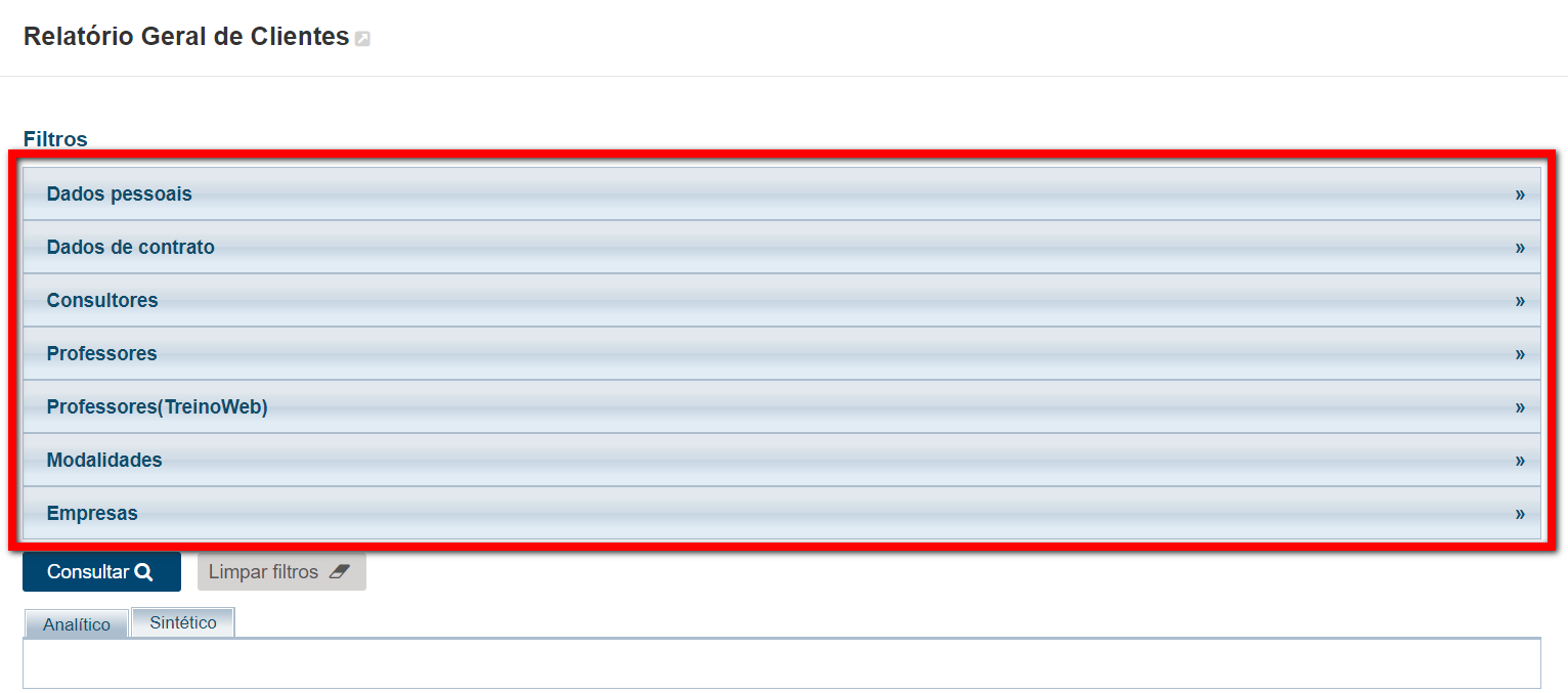 Geral de Clientes é uma ferramenta que permite gerar uma variedade de relatórios dos cadastros de alunos e visitantes da sua empresa. Para isso, é disponibilizado uma gama de filtros permitindo buscar cadastros em variadas situações.