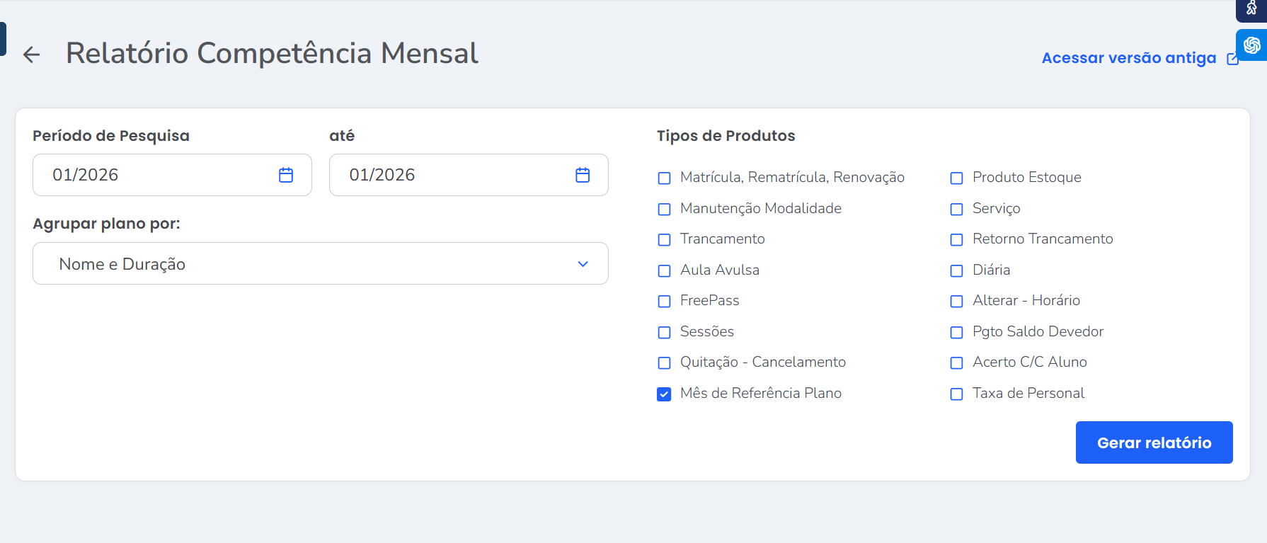 • Aula Avulsa: marque caso deseje ver os valores de competência das as aulas avulsas;