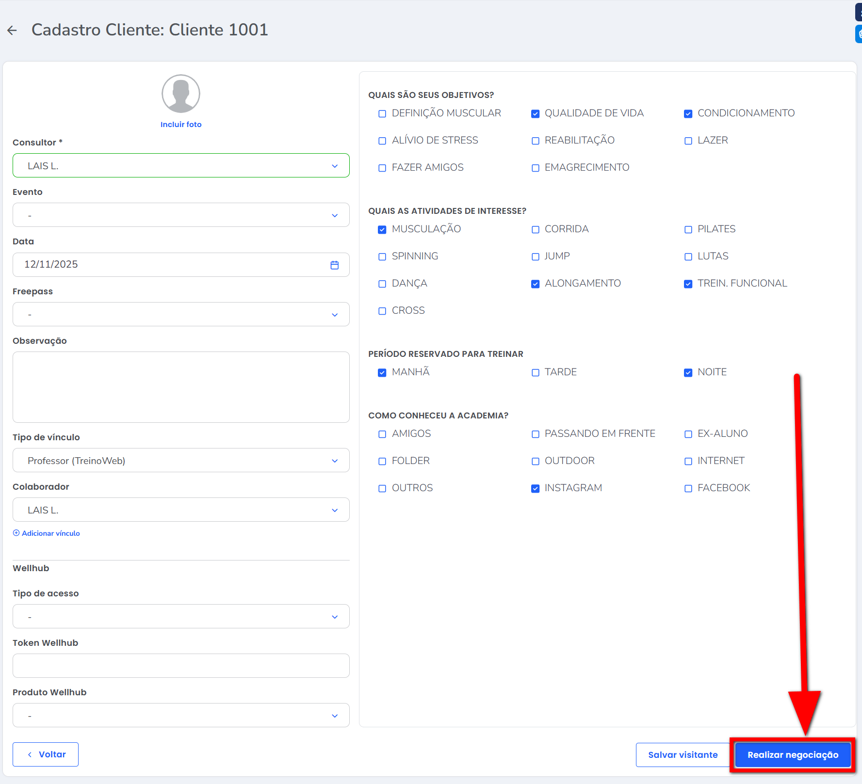 Para saber como cadastrar um cliente/visitante/aluno, clique aqui.