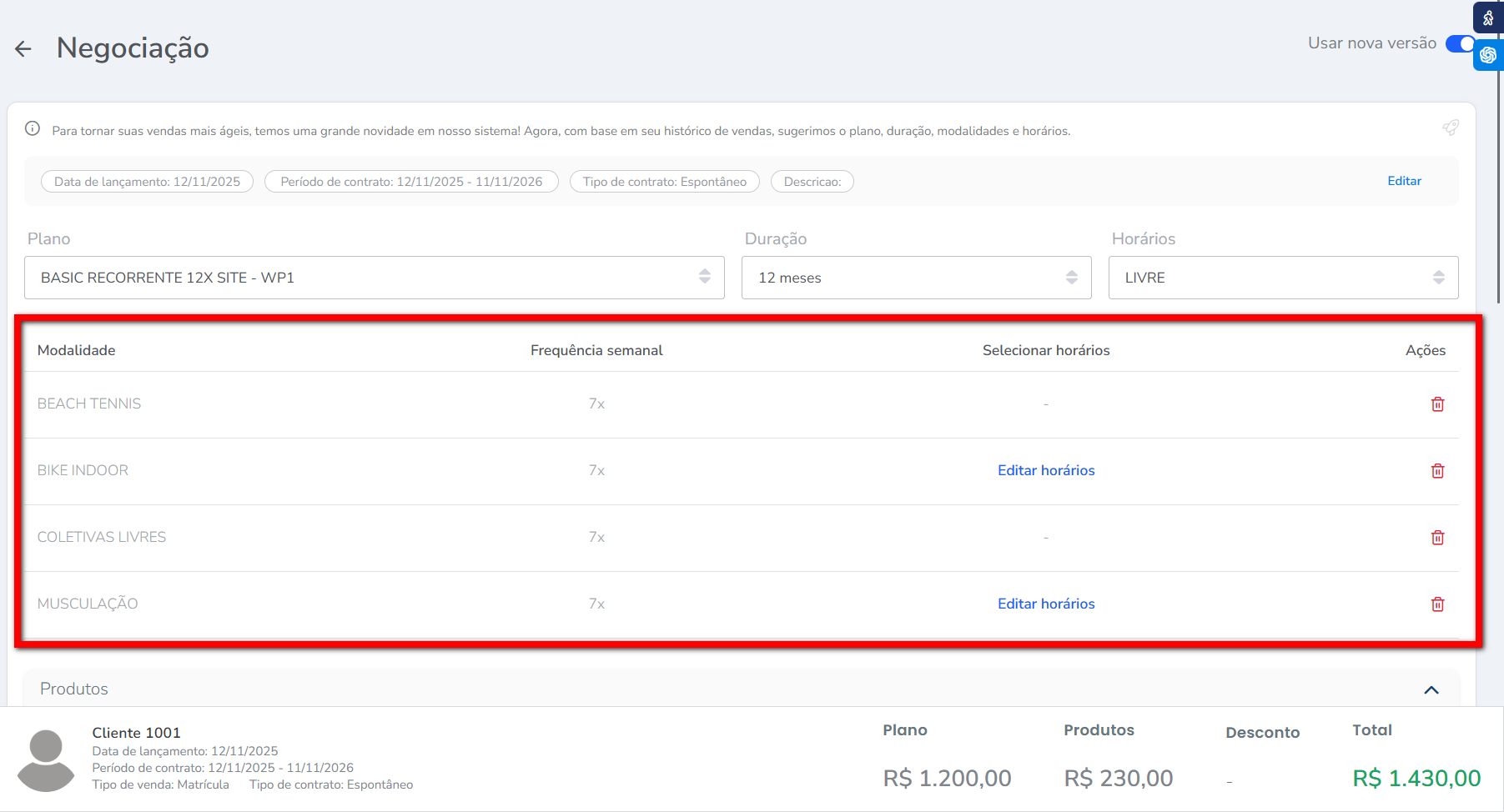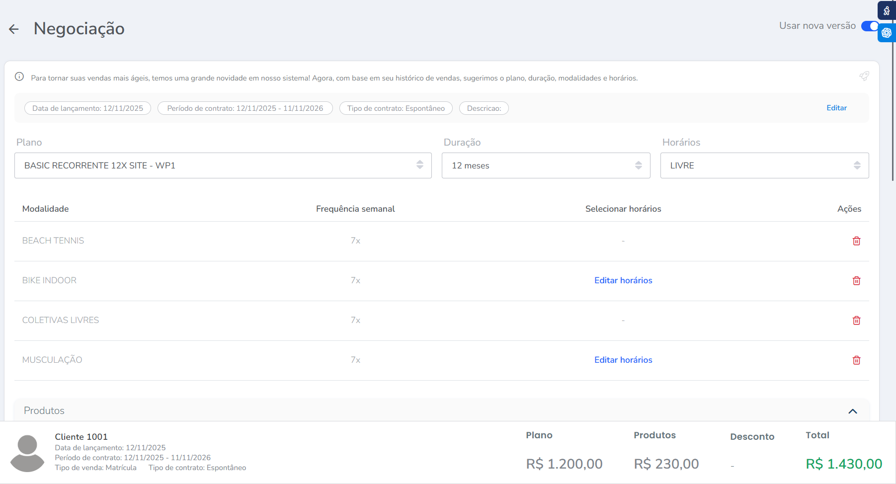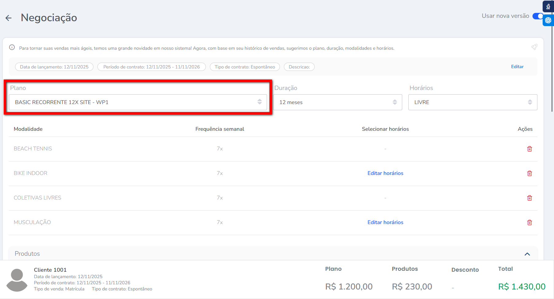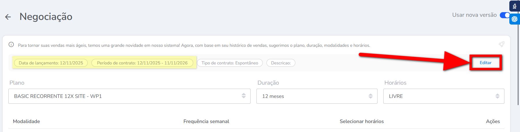 Atenção: a ferramenta de negociação conta com uma inteligência artificial que aprende de acordo com o comportamento de vendas da empresa, ou seja, o sistema escolherá o plano com base no histórico de vendas do consultor ou da academia. O sistema já sugere a duração, horário e modalidades mais vendidas, mas você pode alterar o plano quando necessário.