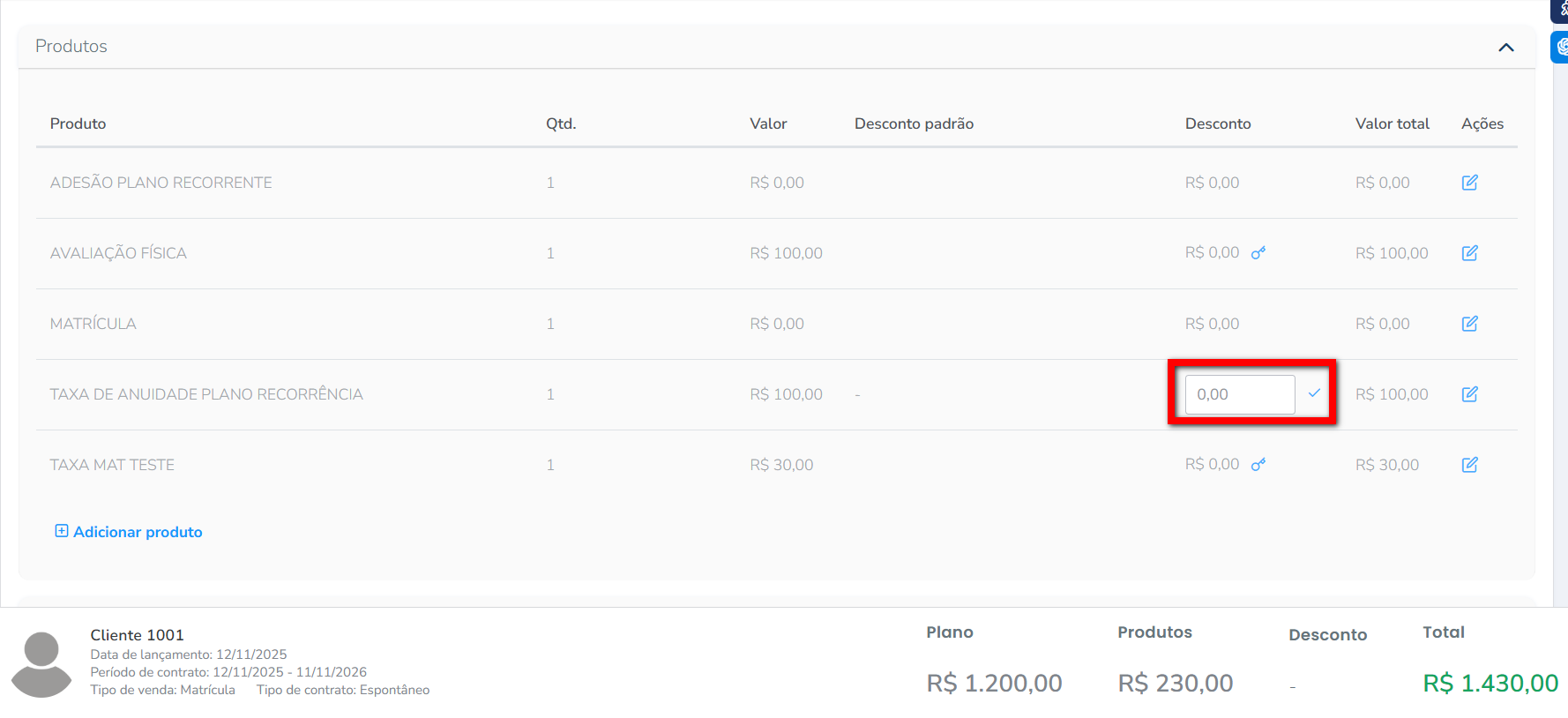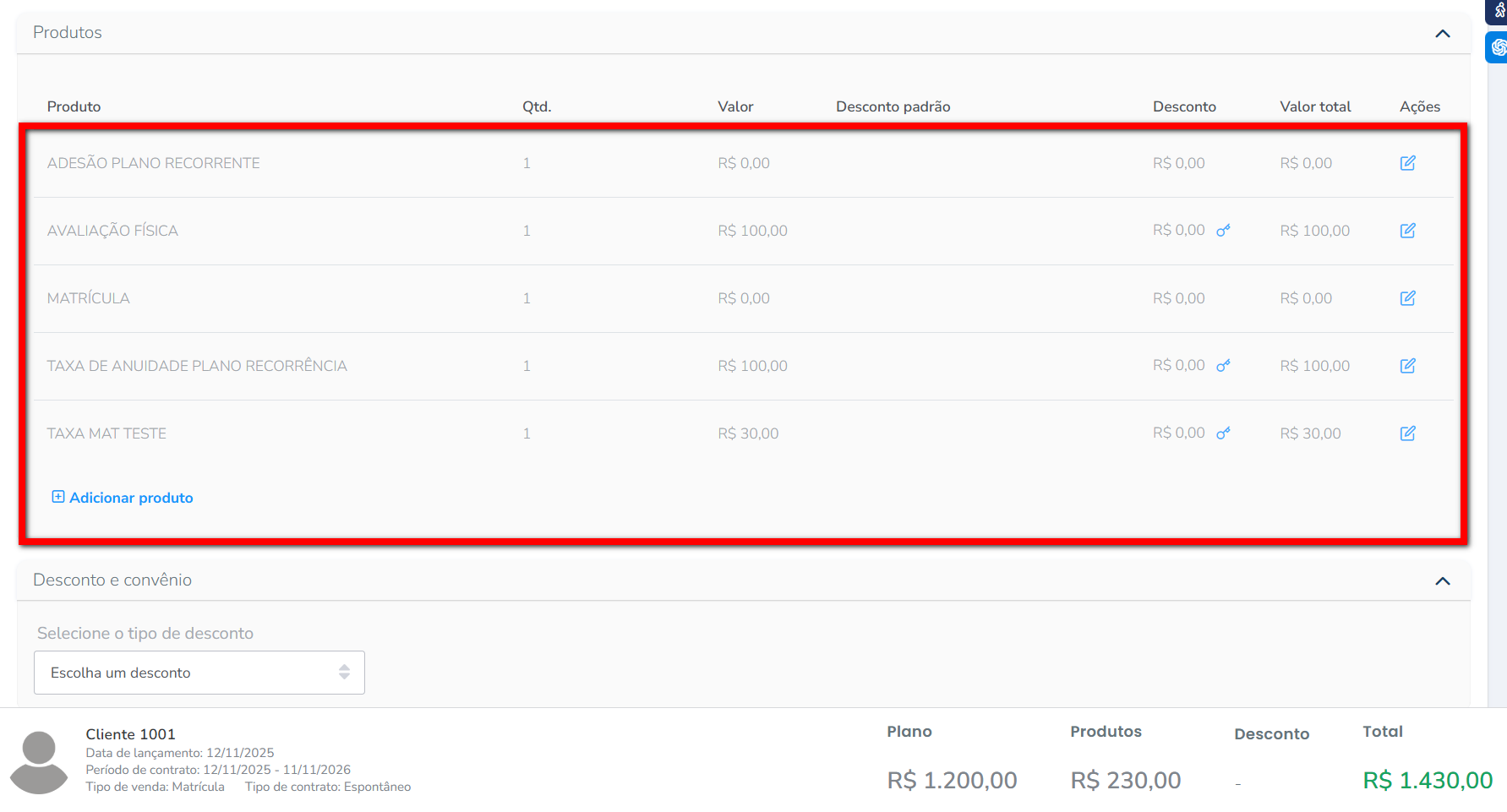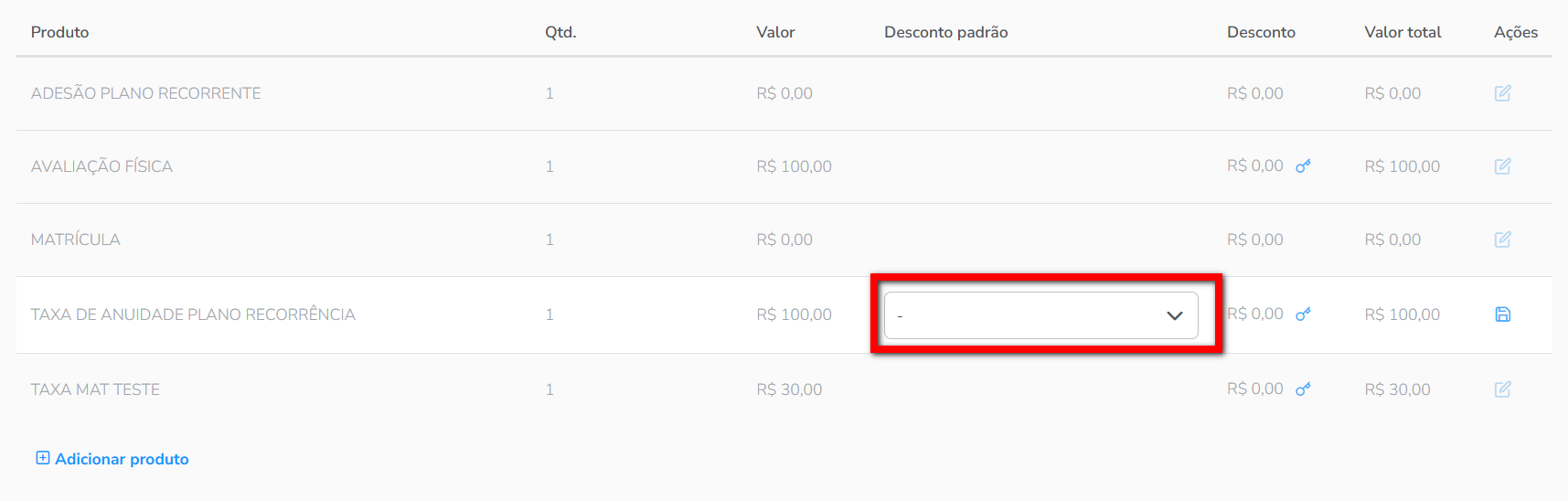 6.3. Se clicar em “Adicionar produto” você pode selecionar um produto da listagem para realizar a venda junto com o plano. Após informar o valor clique no ícone para confirmar.