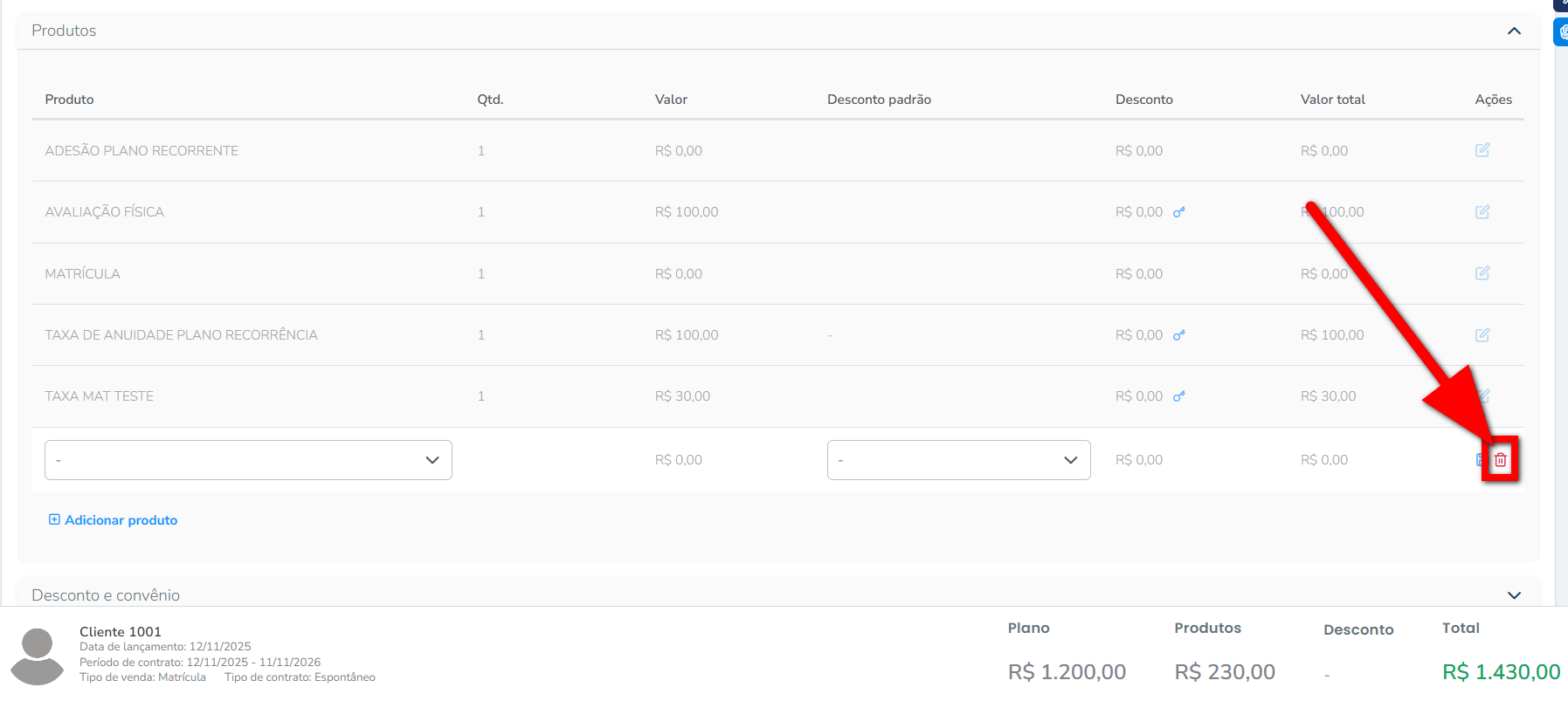 6.4. Você também pode excluir um produto adicionar no plano. Para isso basta clicar no ícone