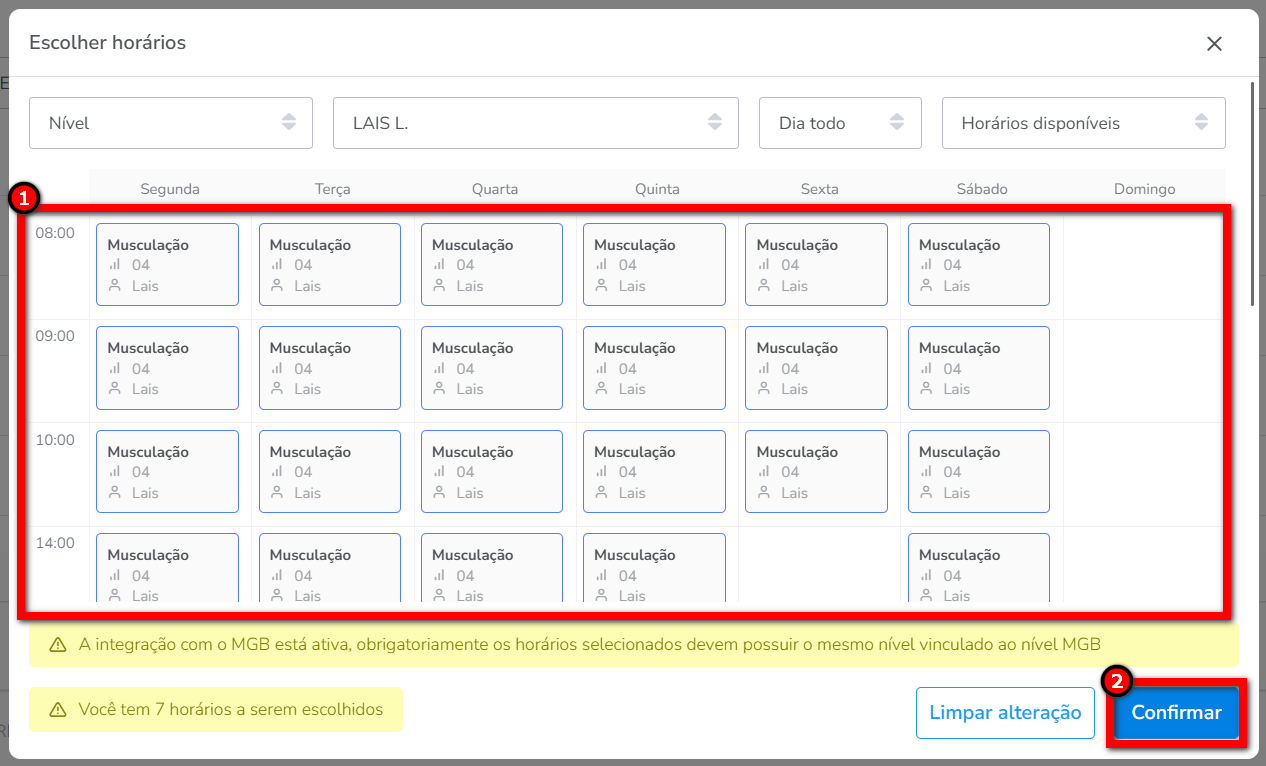 Observação: o sistema mostra na parte inferior da tela a quantidade de marcações ainda a serem escolhidas de acordo com as vezes da semana da modalidade nesse plano.