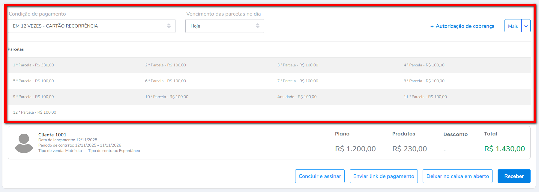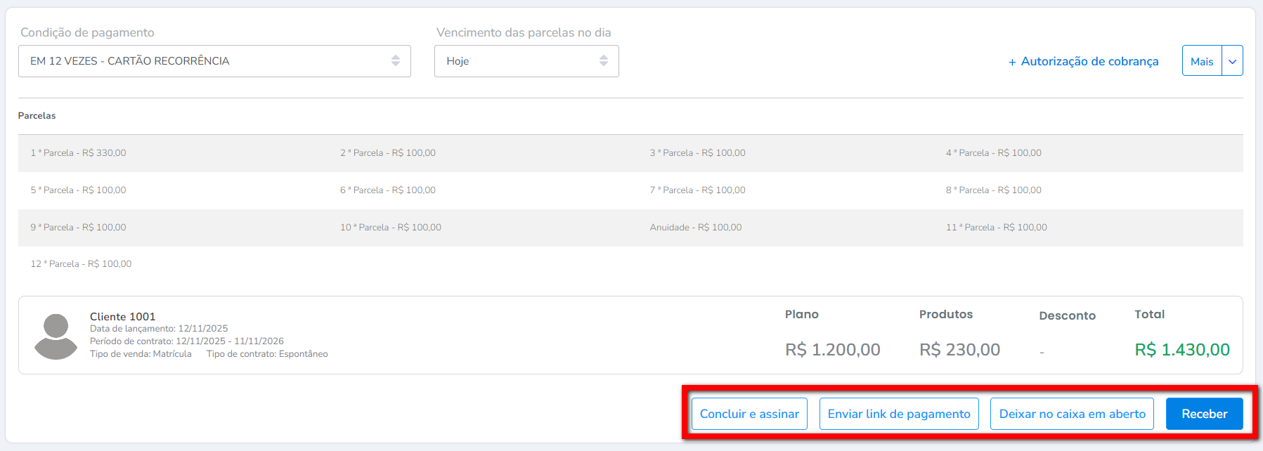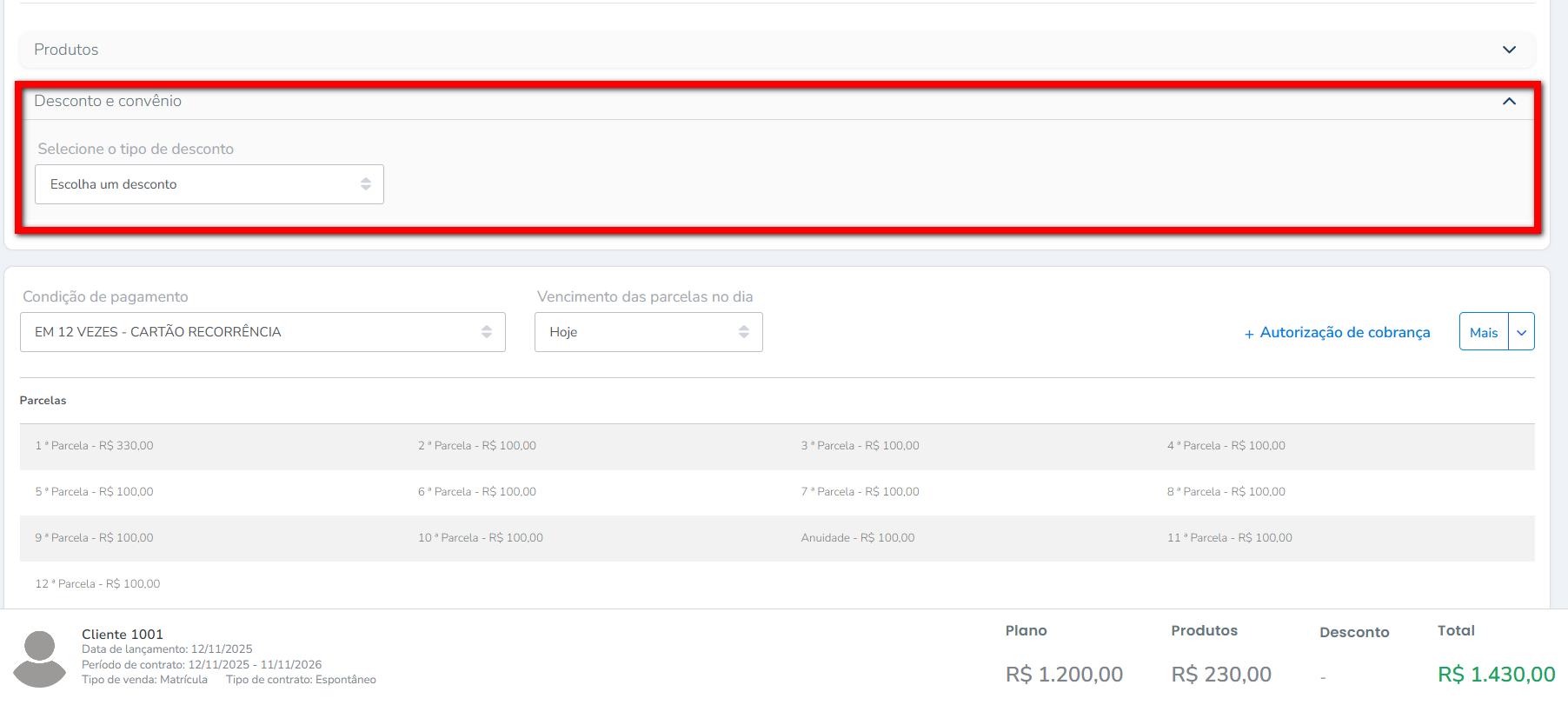 Observação: o valor pode alterar devido a configuração do Pró-rata. Para saber mais sobre o Pró-rata, clique aqui. - Autorização de cobrança: clique para adicionar uma nova forma de cobrança;