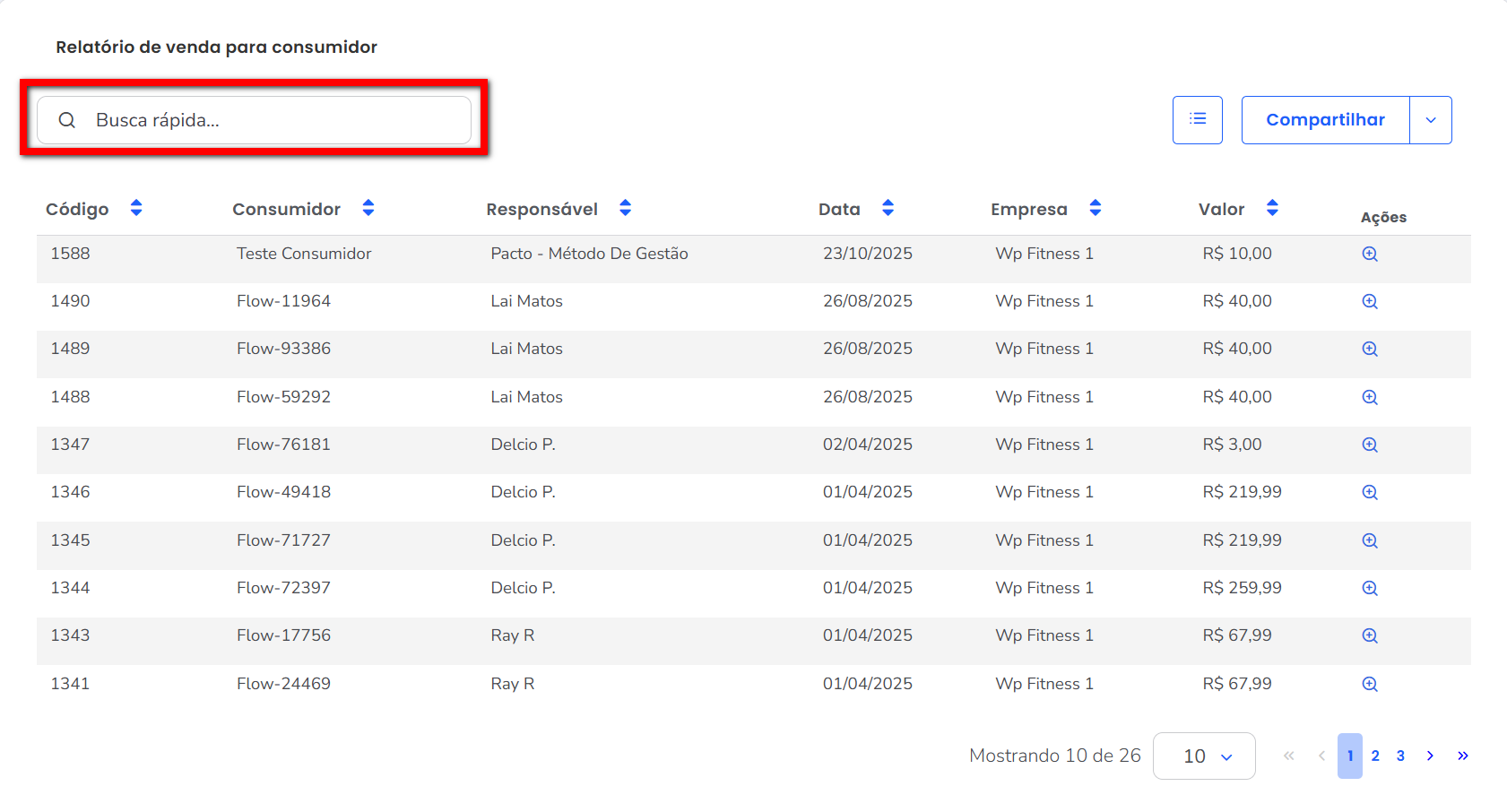 3. No campo de “Busca rápida“, você pode localizar pelo nome de um consumidor. Basta digitar que o sistema apresenta abaixo o resultado.