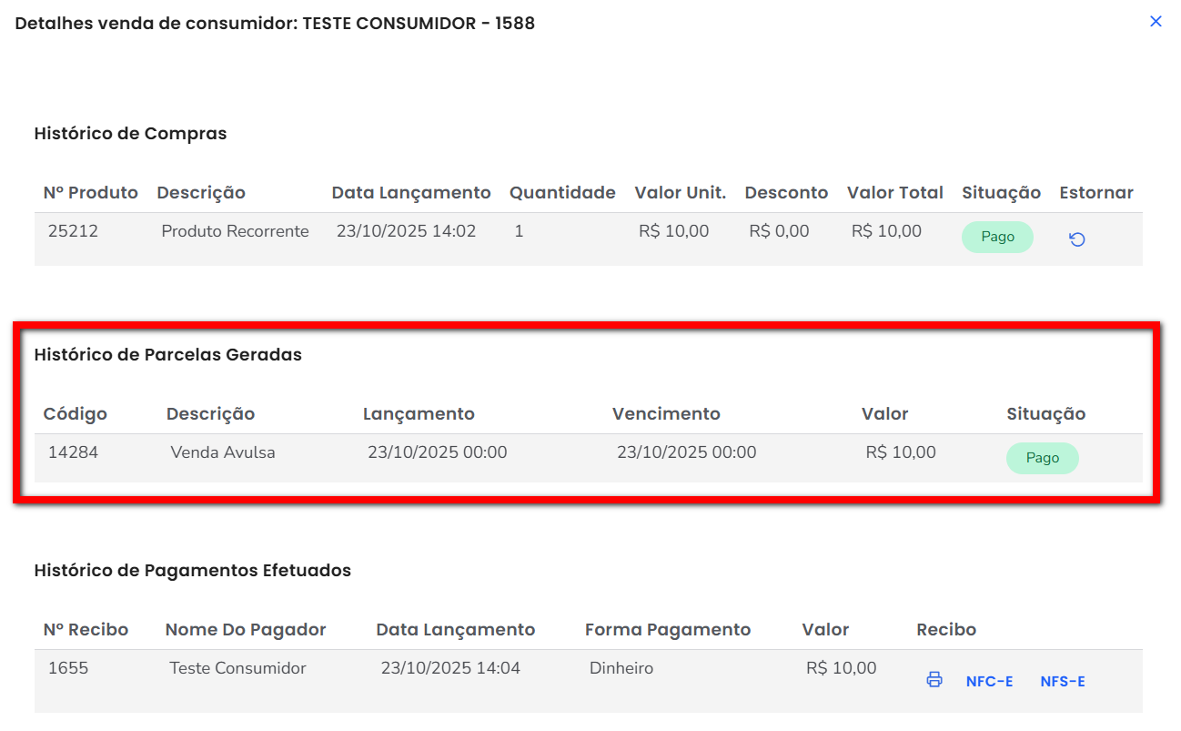 Aqui apresenta todos as parcelas geradas para a venda.