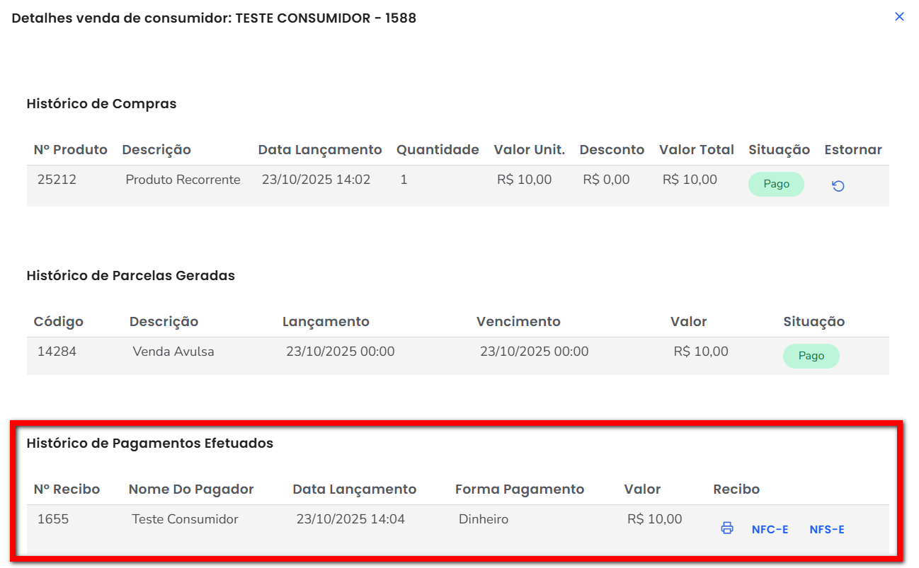 Aqui apresenta todos os pagamentos efetuados referente a venda realizada.