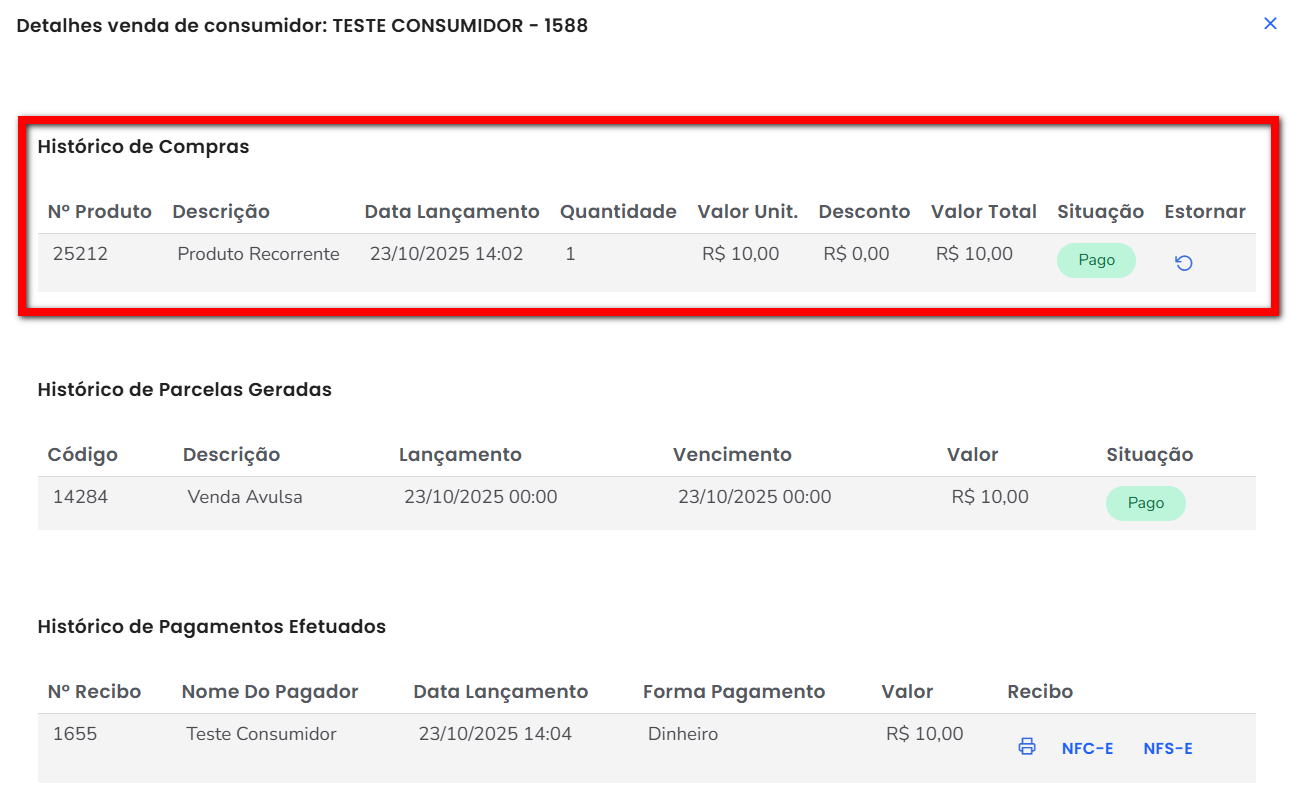4. Clicando sobre um dos resultados consegue obter o detalhe da venda de consumidor.