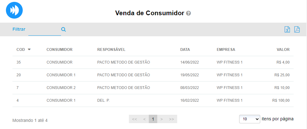3. No canto superior esquerdo é possível pesquisar pelo nome de um consumidor e do lado direito é possível exportar a consulta para PDF e Excel;