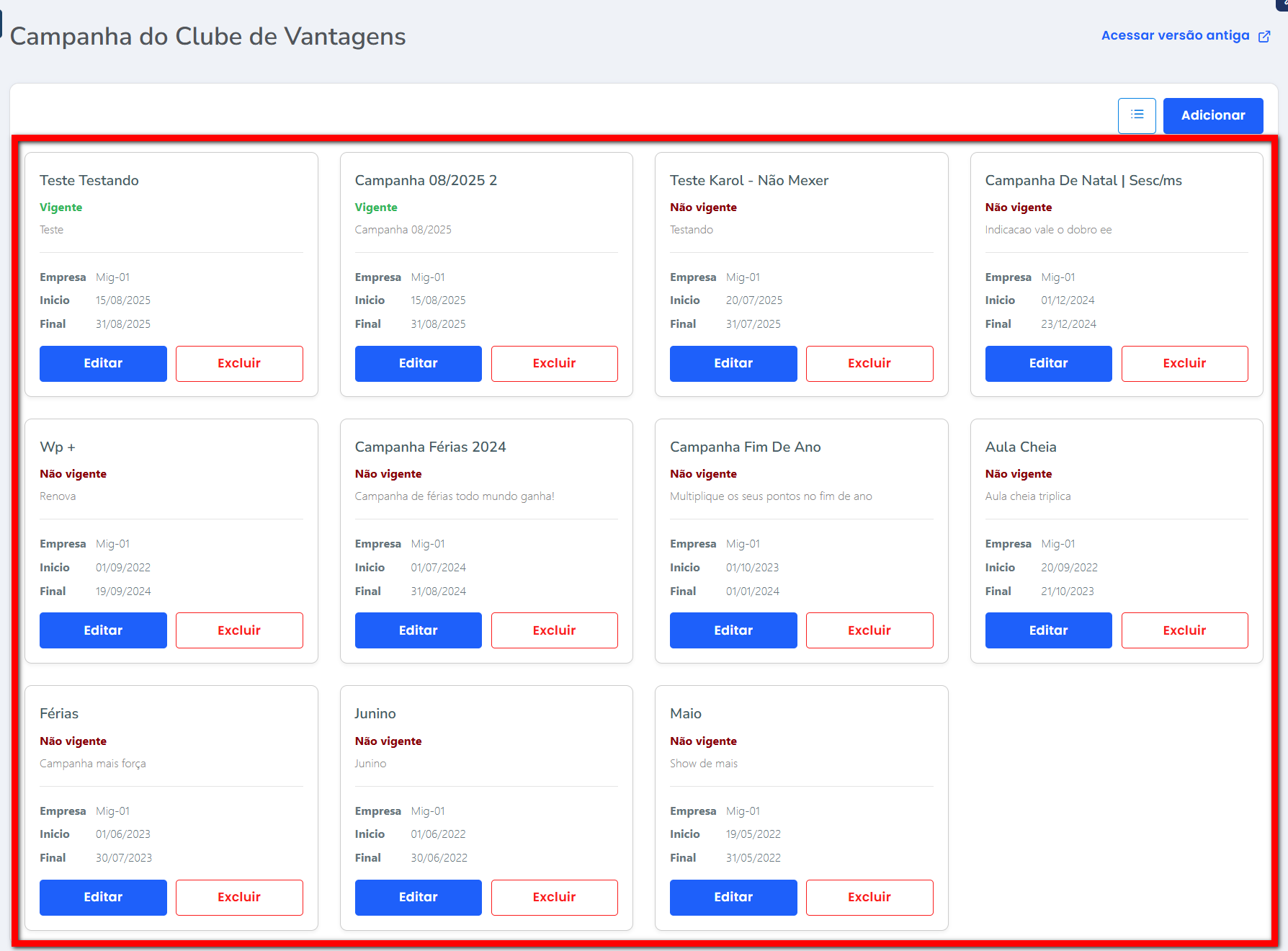 2. Serão apresentadas as Campanhas já criadas, indicando através do status se estão “Vigente” ou “Não Vigente“, além de exibir a data de início e fim da campanha.
