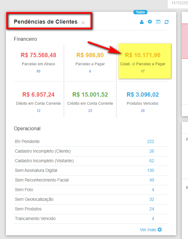 No BI “Pendências de Clientes” você pode visualizar todas as parcelas pendentes de pagamento dos colaboradores.