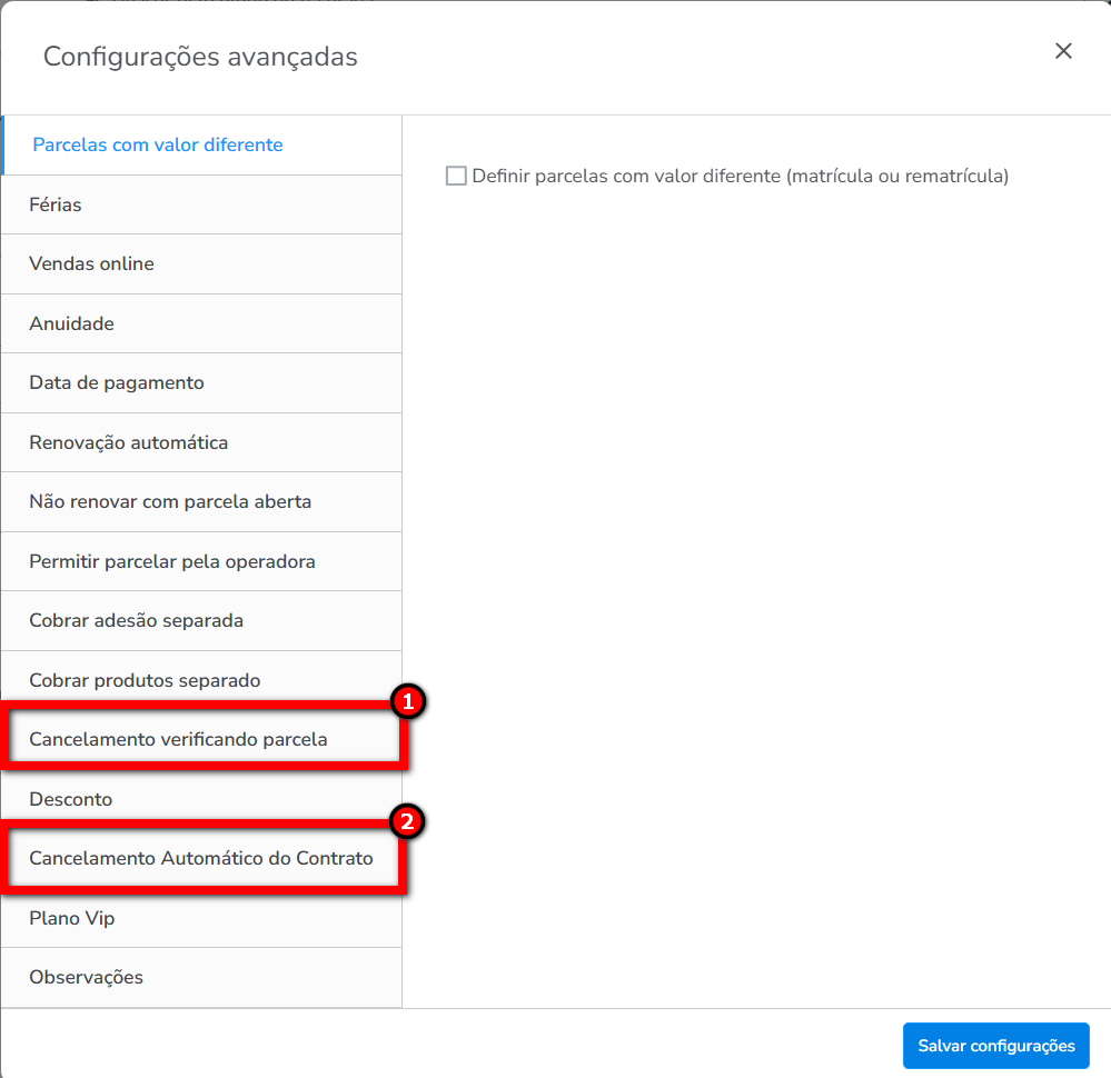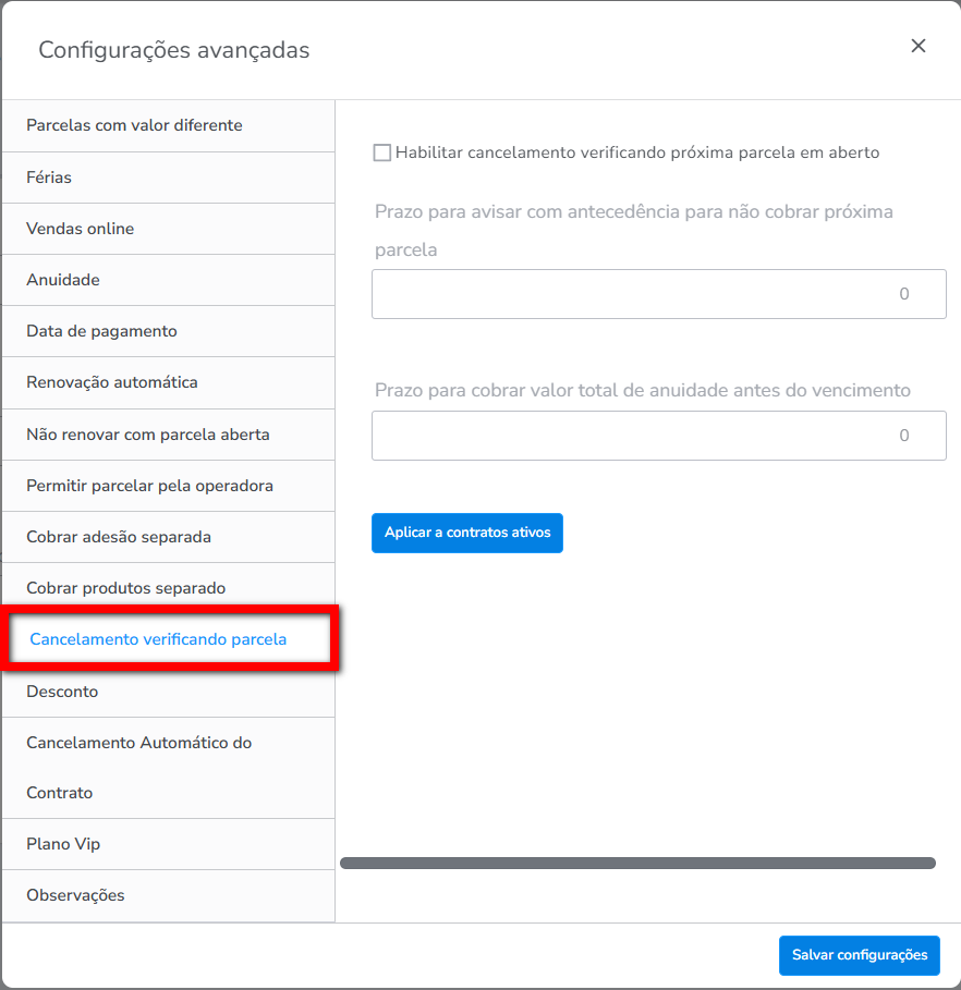 • A configuração de “Cancelamento verificando parcela” permite que, após marcar a opção “Habilitar cancelamento verificando próxima parcela em aberto“, o sistema considerará que o aluno tem um prazo para avisar com antecedência sobre o cancelamento. E com a configuração habilitada é também liberado, em seguida, as demais configurações para preencher como desejar;