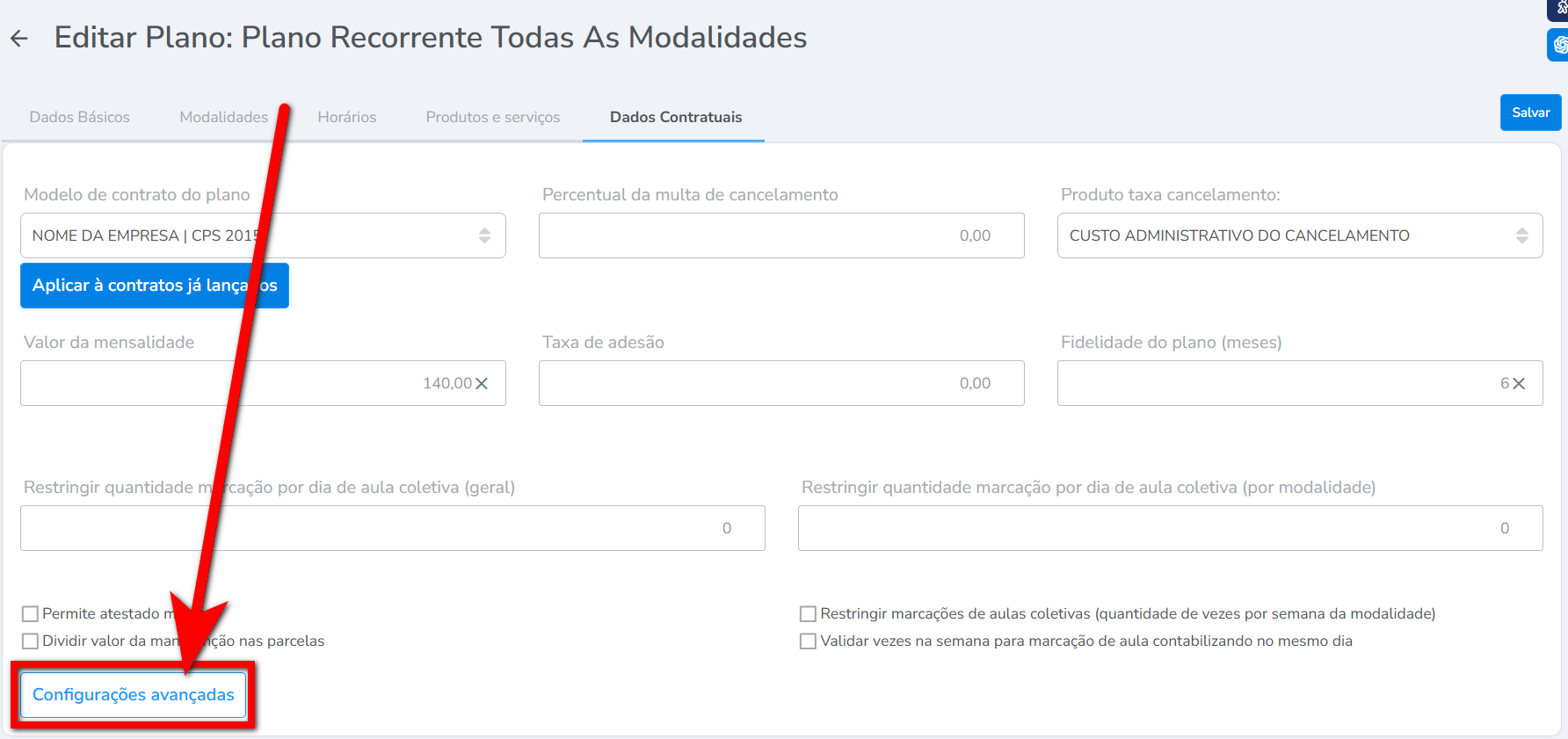 3.2. Se for plano do tipo Recorrência, na guia “Dados Contratuais“, localize e clique em “Configurações Avançadas“.