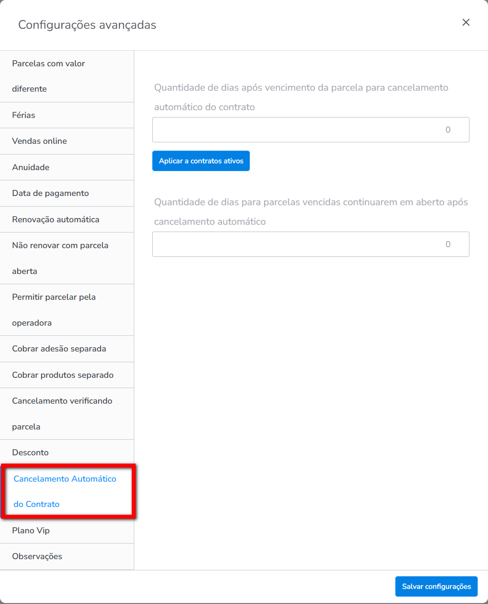 • Aplicar a contratos ativos: ao clicar neste botão as configurações realizadas serão aplicadas a todos os contratos vendidos antes dos ajustes desejados.