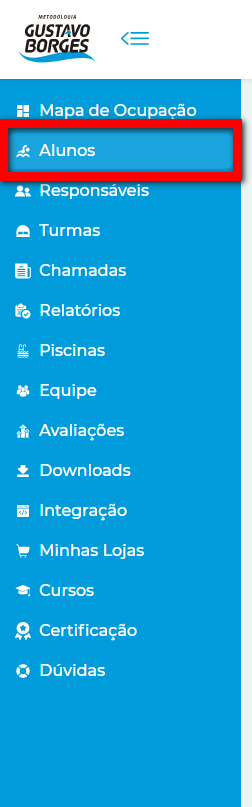 1. Ao acessar o sistema MGB, no menu lateral “Alunos“;