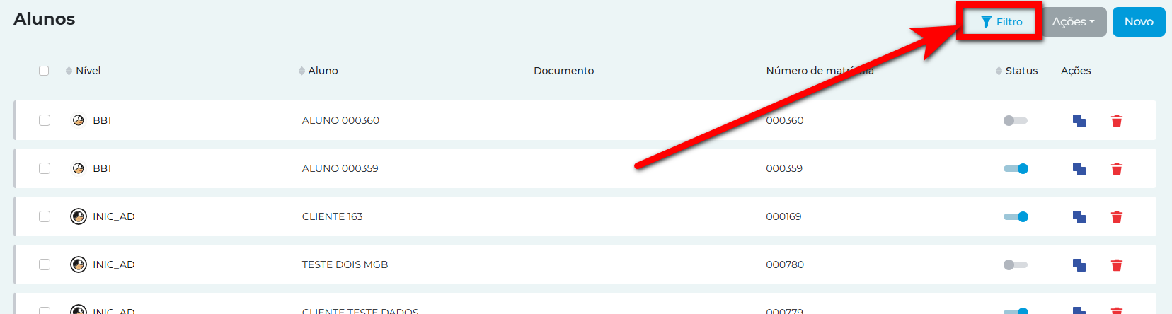 2. Em seguida utilize o filtro para localizar o aluno desejado;