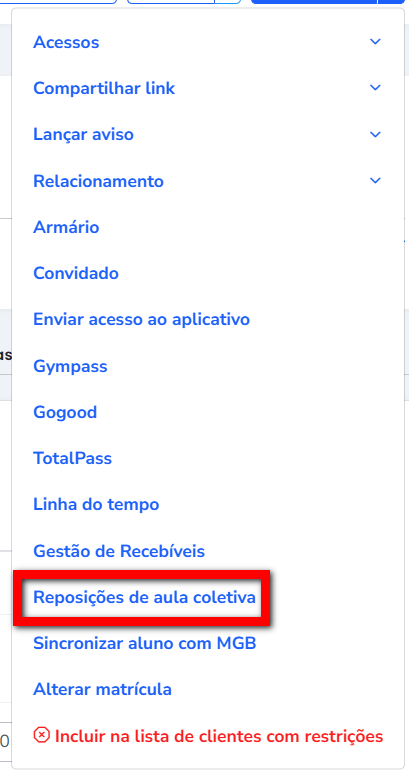 2. Em seguida, clique em “Reposições de aula coletiva“;