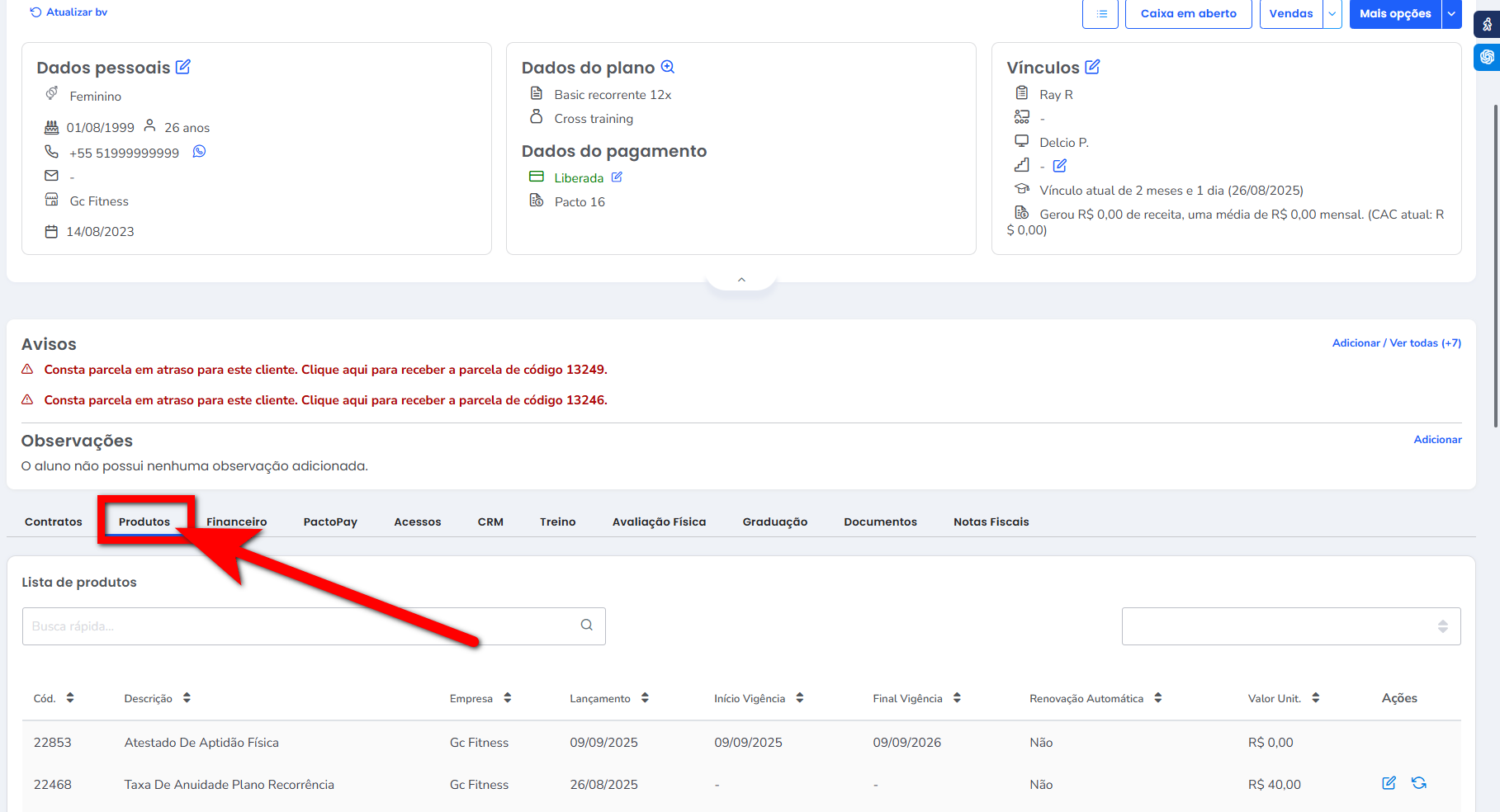 1. Ao acessar o perfil do cliente, localize e clique na guia “Produtos“;