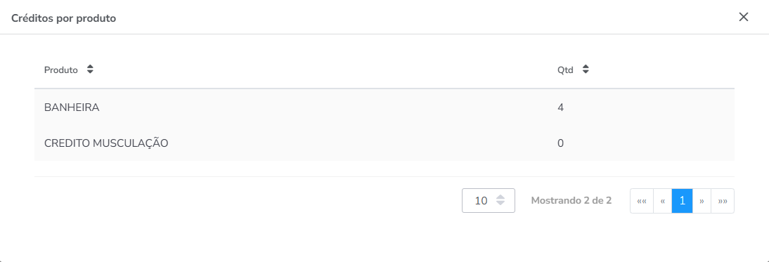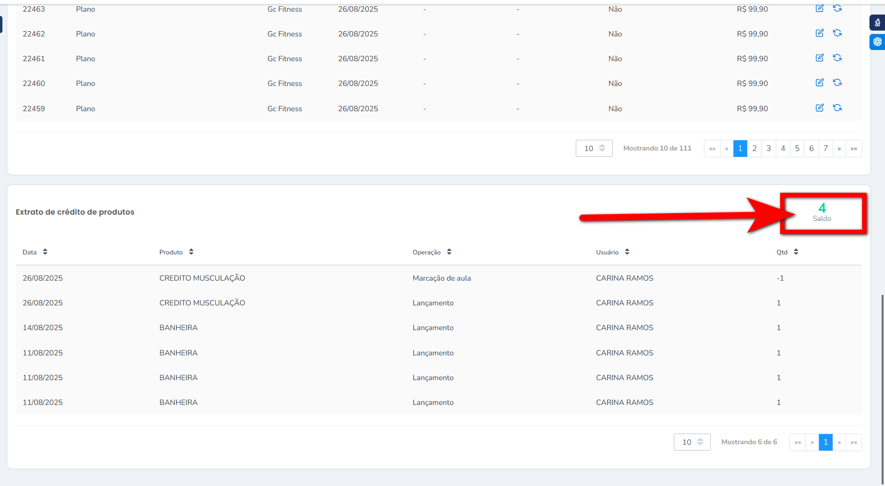 2. No bloco “Extrato de crédito de produtos”, visualize o histórico de créditos do aluno, com todas as entradas e saídas de crédito;