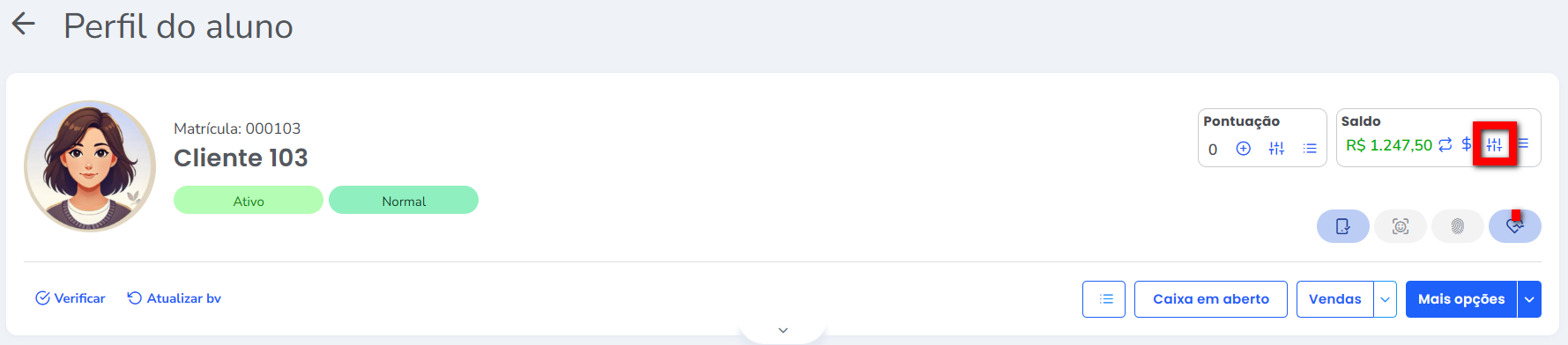 1. Ao acessar o perfil do aluno, localize o saldo da conta corrente e clique no ícone ;