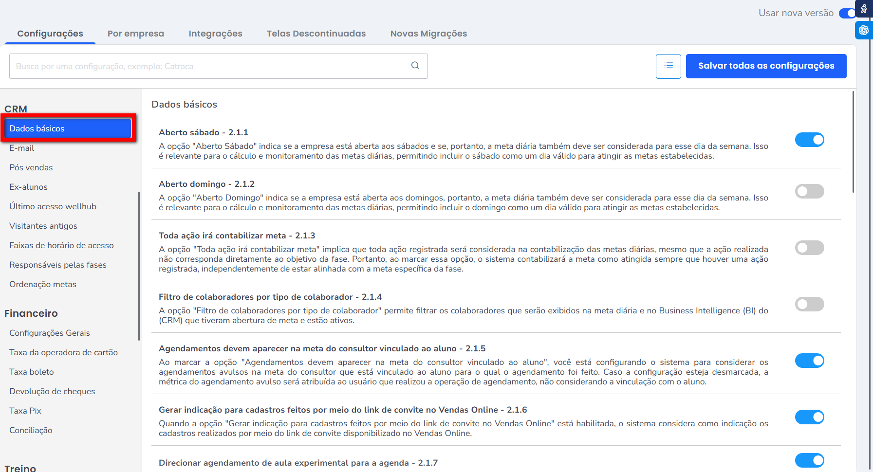 Para saber sobre a nova tela de configurações, clique aqui.