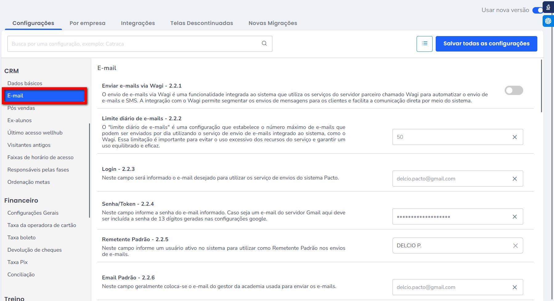 - Email Padrão – 2.2.6: neste campo geralmente coloca-se o e-mail do gestor da academia usada para enviar os e-mails;