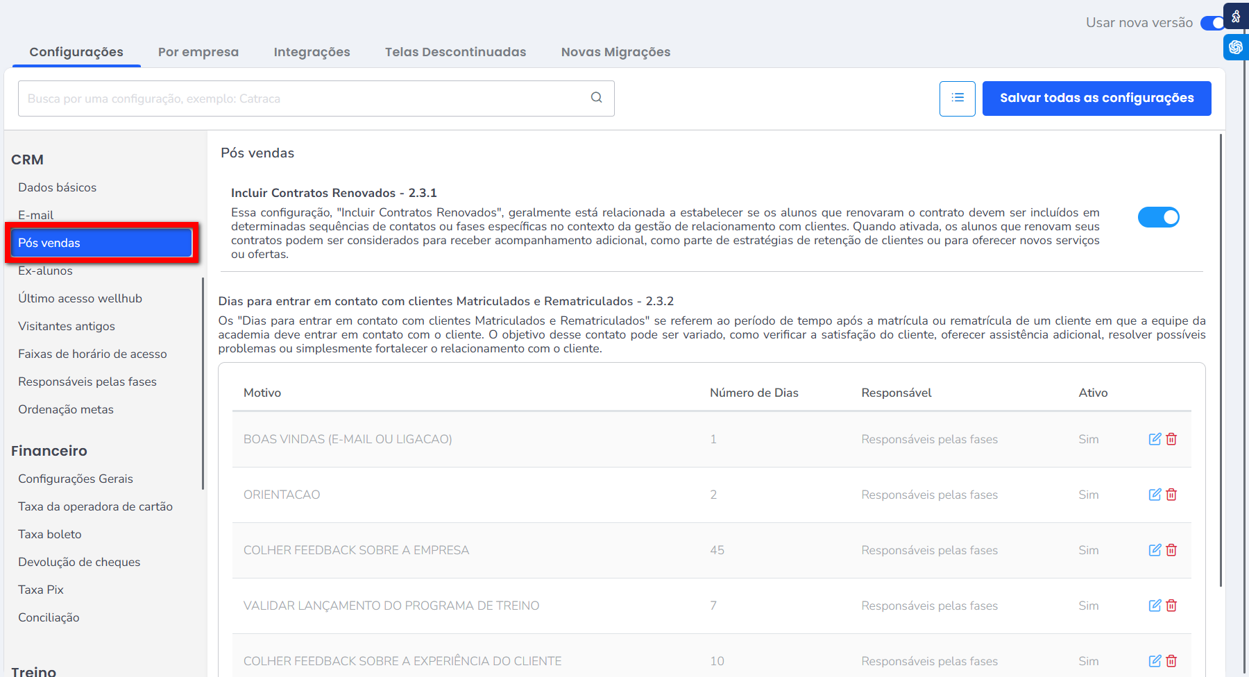 Por exemplo: se um aluno renovou um plano, seguindo essa configuração, ele retornará novamente para o fluxo inicial. - Dias para entrar em contato com clientes Matriculados e Rematriculados – 2.3.2: se referem ao período de tempo após a matrícula ou rematrícula de um cliente em que a equipe da academia deve entrar em contato com o cliente. O objetivo desse contato pode ser variado, como verificar a satisfação do cliente, oferecer assistência adicional, resolver possíveis problemas ou simplesmente fortalecer o relacionamento com o cliente.