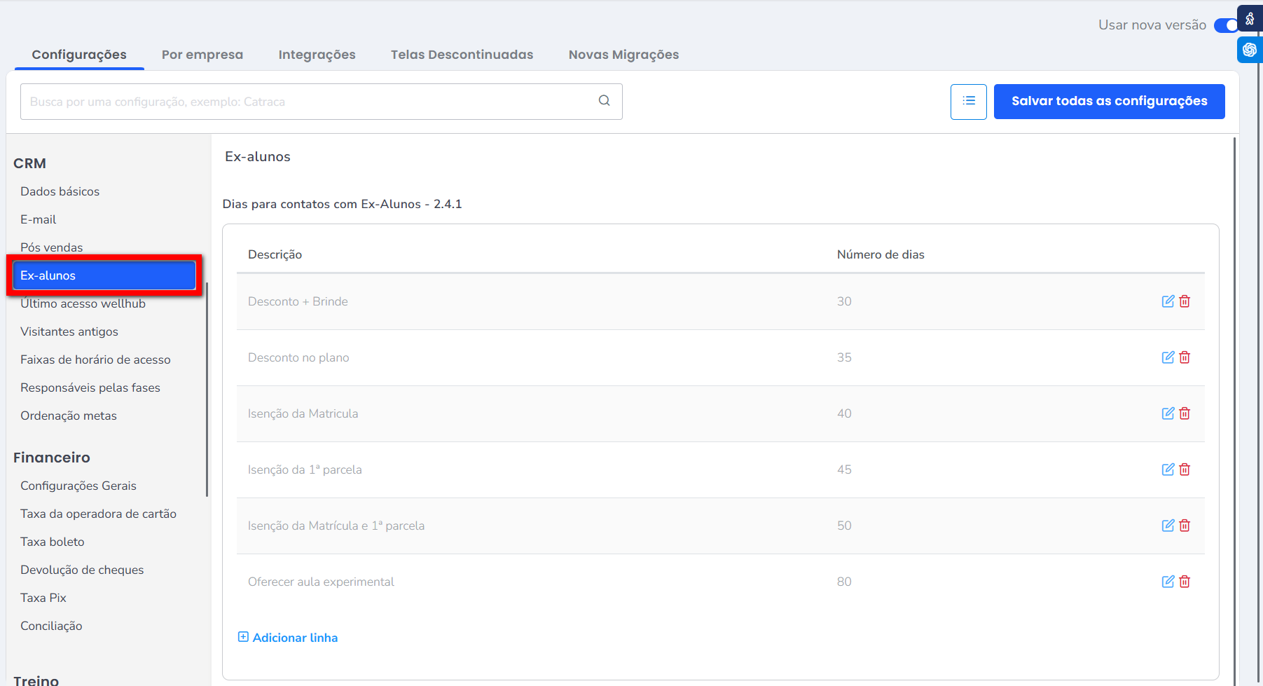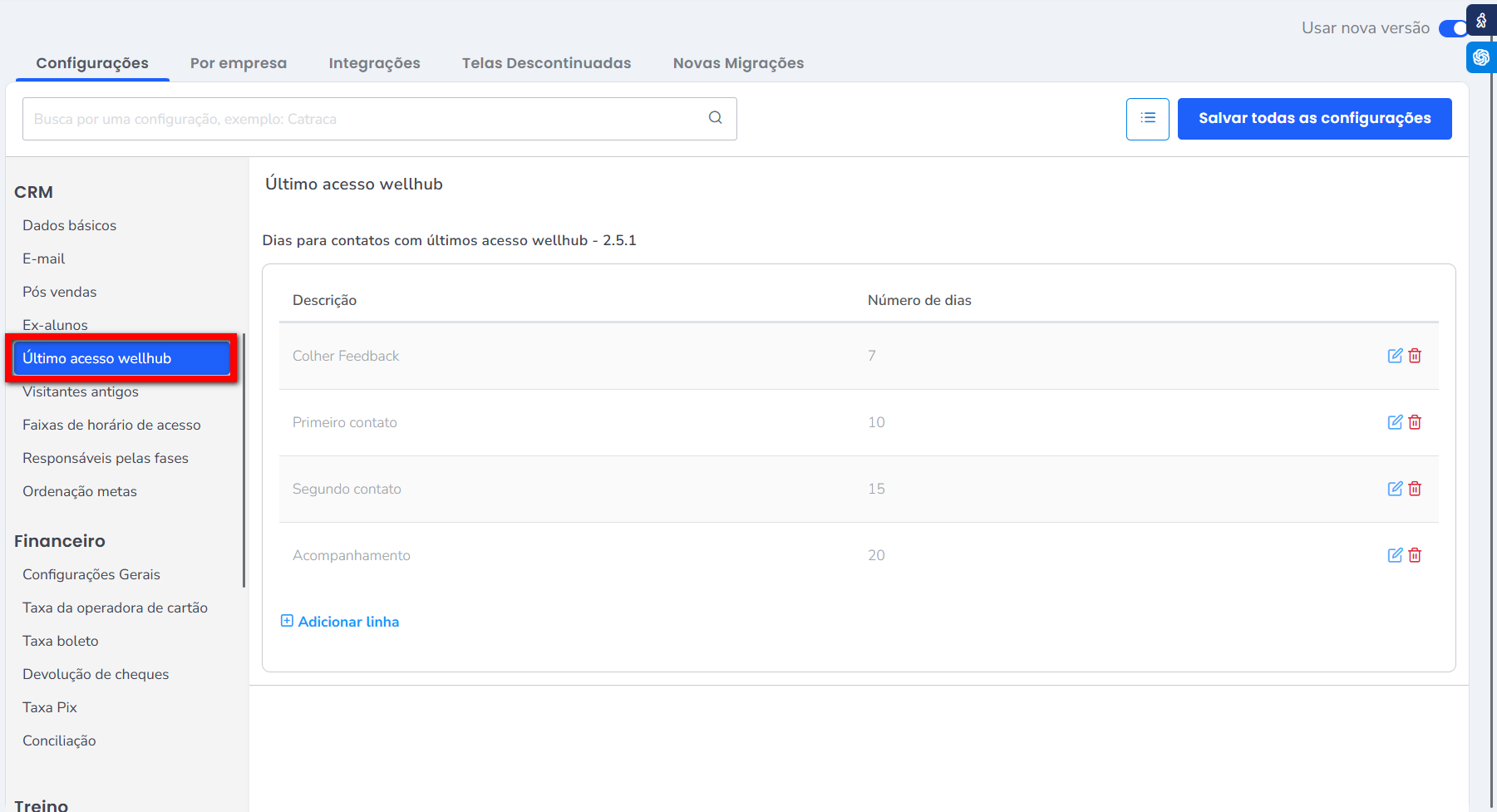 - Dias para contatos com últimos acesso wellhub – 2.5.1: é onde realiza a configuração da quantidade de dias para que os consultores entrem em contato com os clientes Wellhub que possuem o token cadastrado e acessaram a catraca da sua empresa. Clique em “Adicionar linha“.