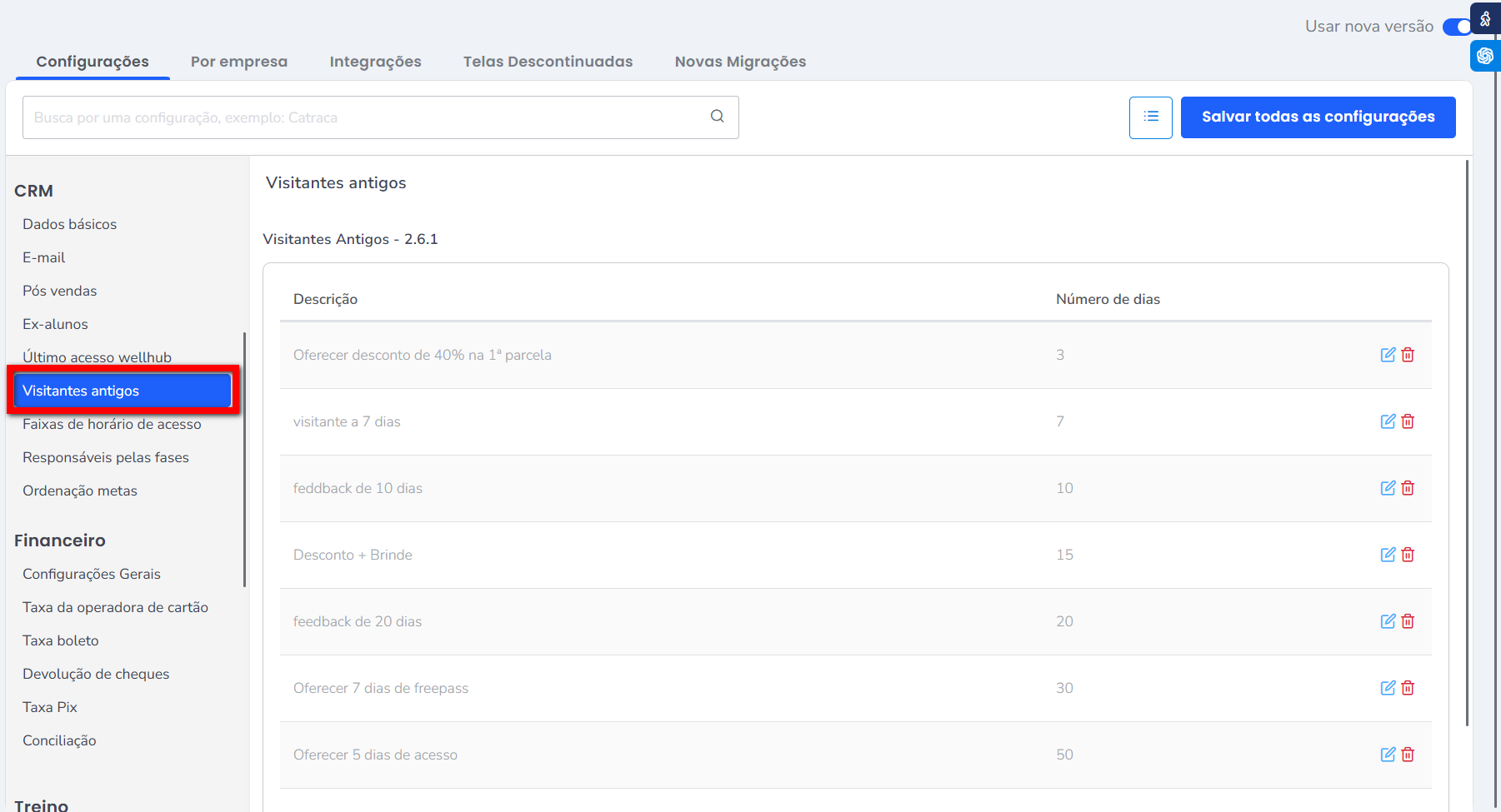 - Visitantes Antigos – 2.6.1: é onde configura o motivo e a quantidade de dias para que os consultores entrem em contato com os visitantes antigos e façam uma negociação de contrato. Assim, preencha os campos “Motivo para entrar em contato com o cliente” e “Número de dias”.
