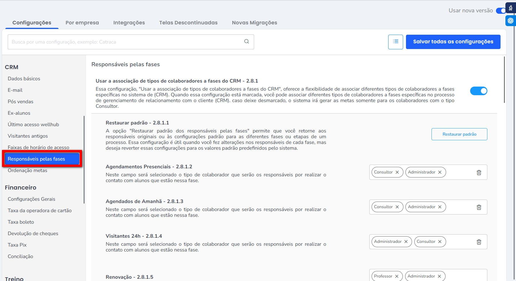 - Contrato autorrenovável entra na fase renovação – 2.1.7: marque caso deseje que os contratos que renovam automaticamente entrem na fase de renovação para que os colaboradores também entrem em contato com esses alunos;
