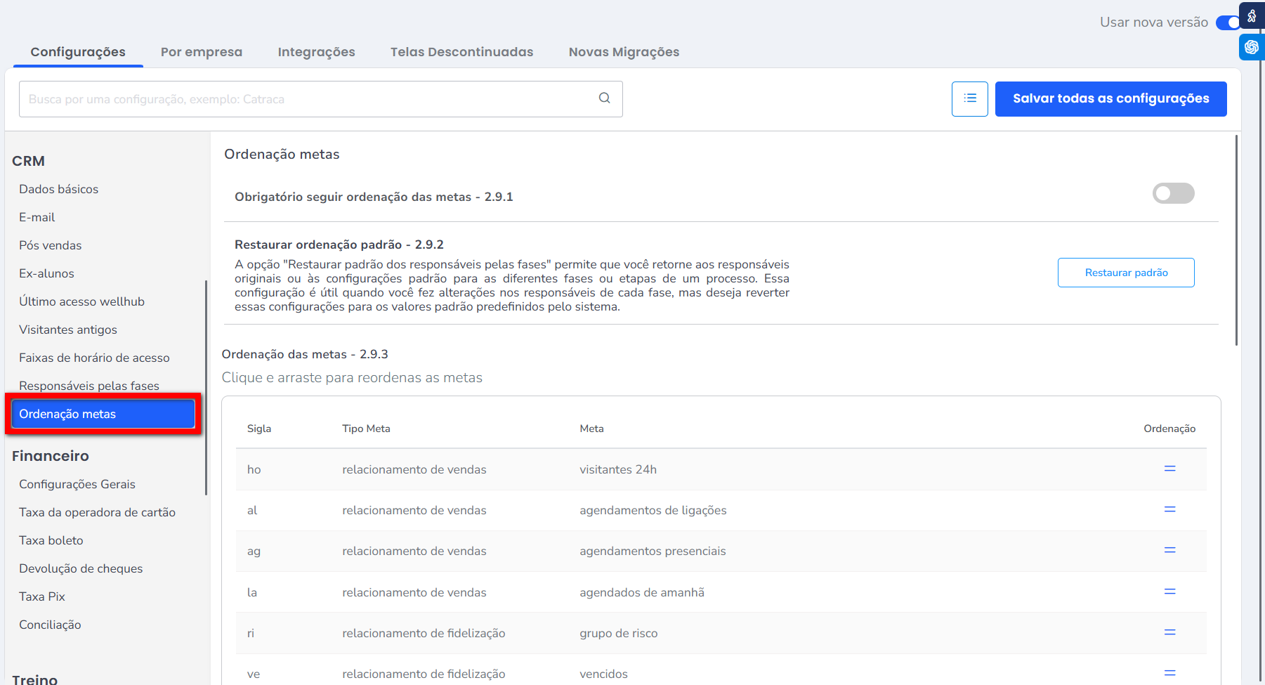 Por exemplo: a primeira fase apresentada é a de Agendamentos de Ligações. O consultor/professor precisa cumprir 100% dessa meta, para poder fazer a fase seguinte que seria Agendamentos Presenciais. Sem cumprir a fase anterior não é possível realizar a próxima fase. - Restaurar ordenação padrão – 2.9.2: permite que você retorne aos responsáveis originais ou às configurações padrão para as diferentes fases ou etapas de um processo. Essa configuração é útil quando você fez alterações nos responsáveis de cada fase, mas deseja reverter essas configurações para os valores padrão pré-definidos pelo sistema;
