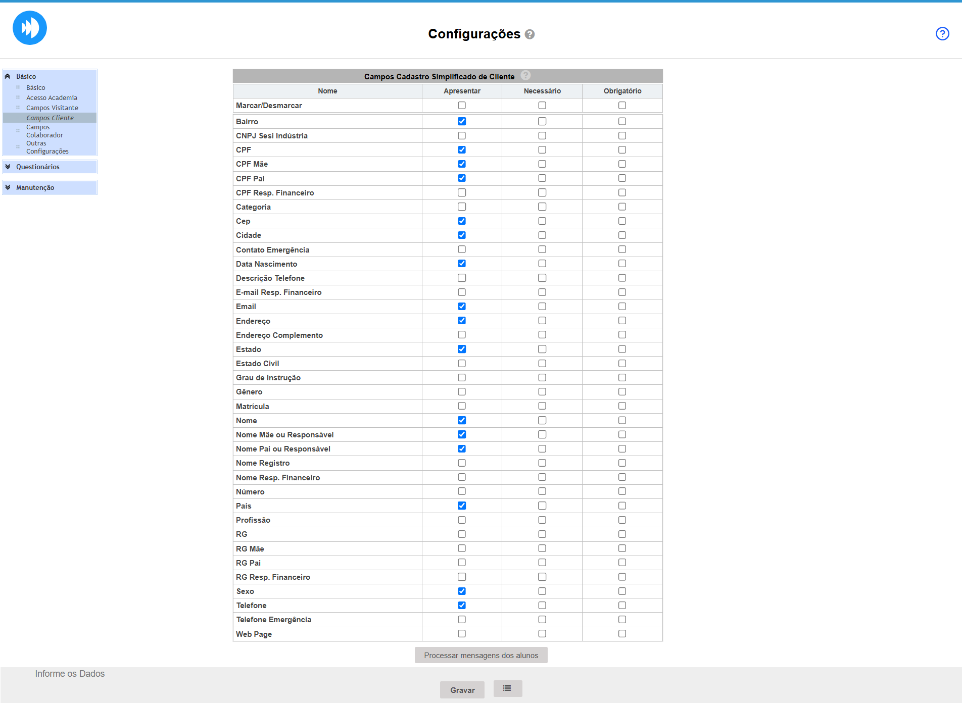 - Necessário: quando é marcado um campo como necessário, ele é automaticamente marcado como apresentar e é mostrado na mensagem do cliente (Cadastro pendente. Falta os seguintes campos: …), caso não seja preenchido no cadastro do cliente.