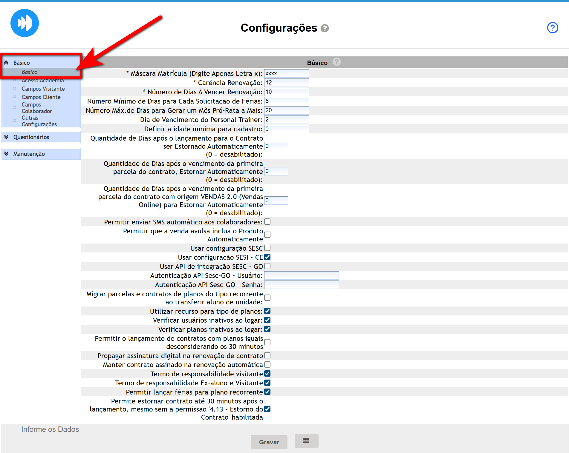 Na guia “Básico” são apresentadas diversas configurações de parâmetros que serão utilizadas no sistema. Isso permite configurar informações básicas como: o número de dias para a renovação, o número mínimo de carências para o plano, entre outros.