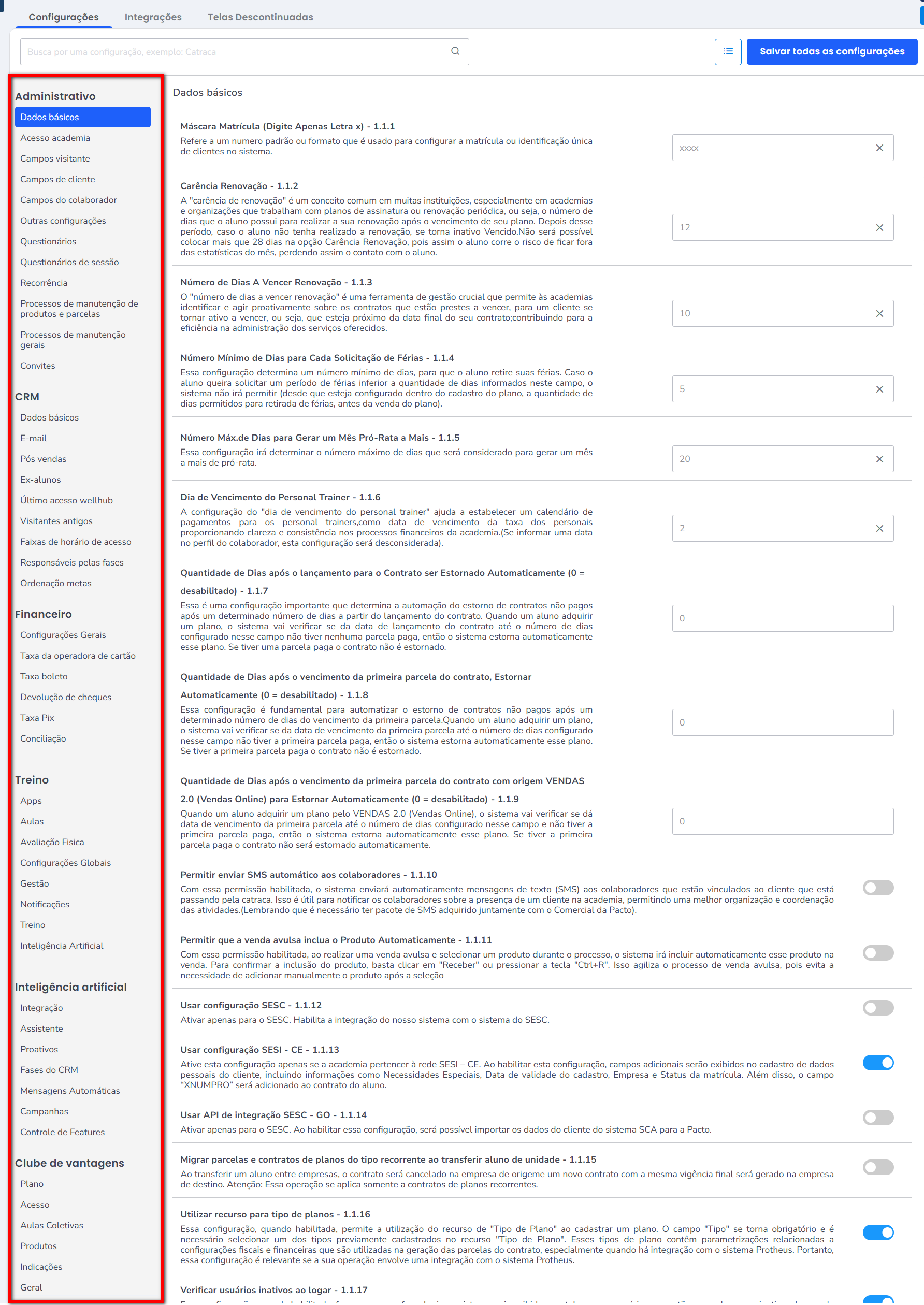 A tela de configurações estão concentradas as principais configurações referente aos módulo ADM, CRM e Financeiro.