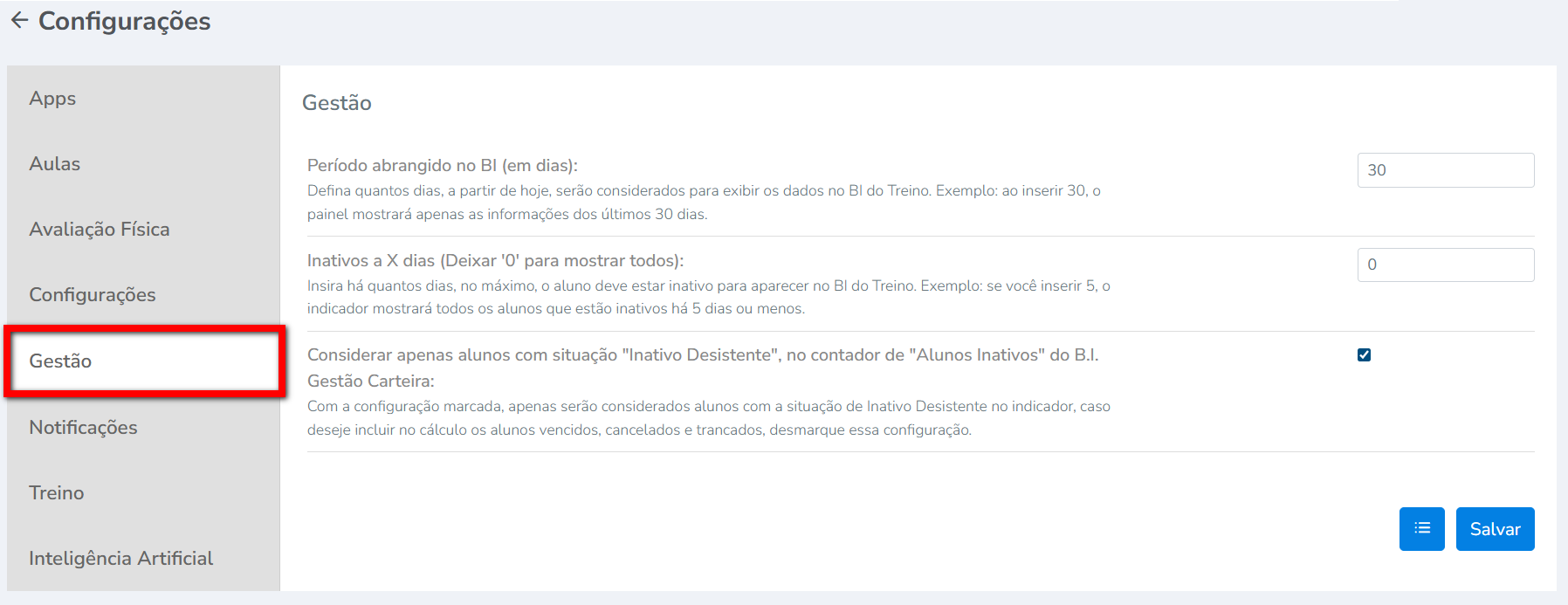 Por exemplo: caso determine 5 dias, no indicador de alunos inativos serão apresentados os alunos que estão a 5 dias inativos dentro do seu sistema. - Considerar apenas alunos com situação “Inativo Desistente”, no contador de “Alunos Inativos” do B.I. Gestão Carteira: ao marcar esta configuração, no indicador de Alunos Inativos serão considerados apenas os alunos que estiverem com a situação Desistente em seu cadastro. Os aluno com situação de Cancelados ou Inativo Vencido não serão contabilizados neste indicador.