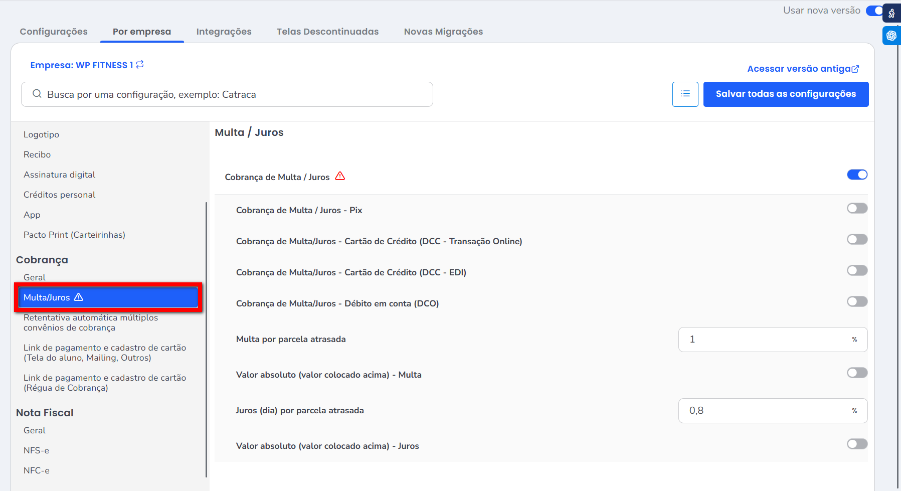 3. Em seguida, acesse a guia “Multa/Juros”, localizada no bloco “Cobranças”. Nela, serão exibidas as configurações disponíveis para habilitar conforme a sua necessidade;