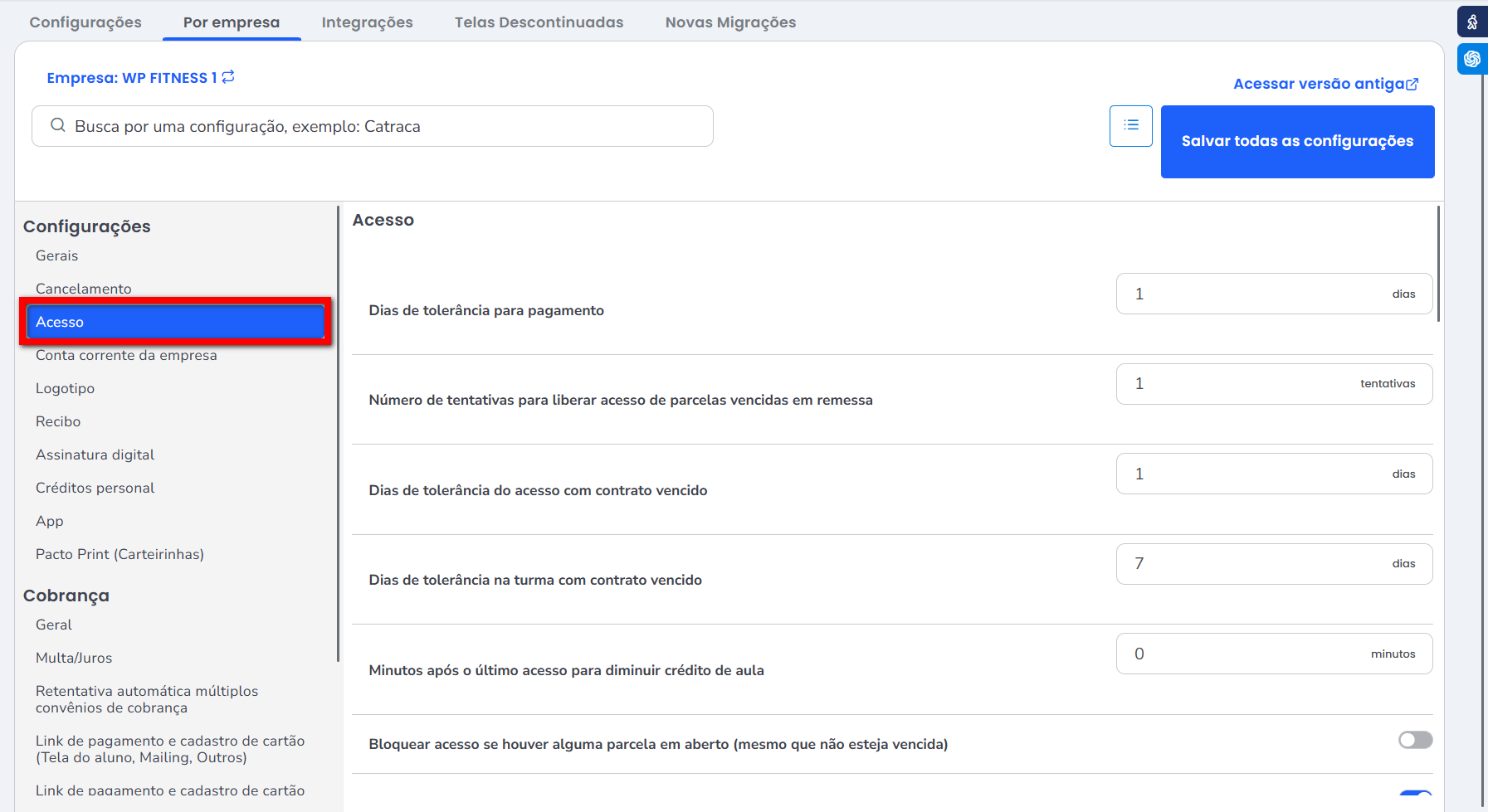 Na guia Acesso nas configurações da empresa, são apresentadas as configurações para o acesso dos clientes e colaboradores pela catraca.
