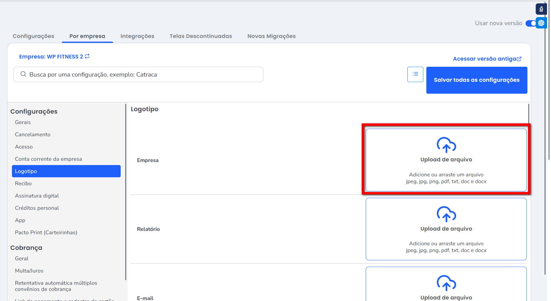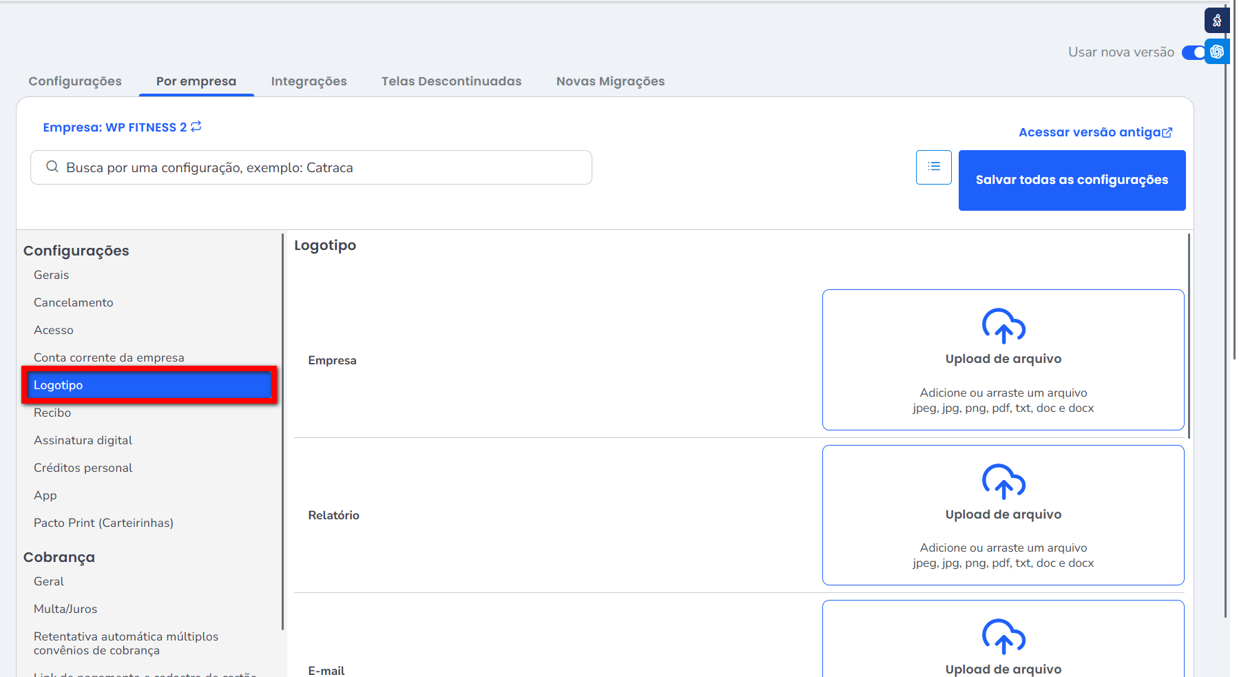 Na guia “Logotipo” das configurações da empresa, é possível adicionar ou alterar o logotipo da empresa, que será utilizado em partes específicas do sistema.