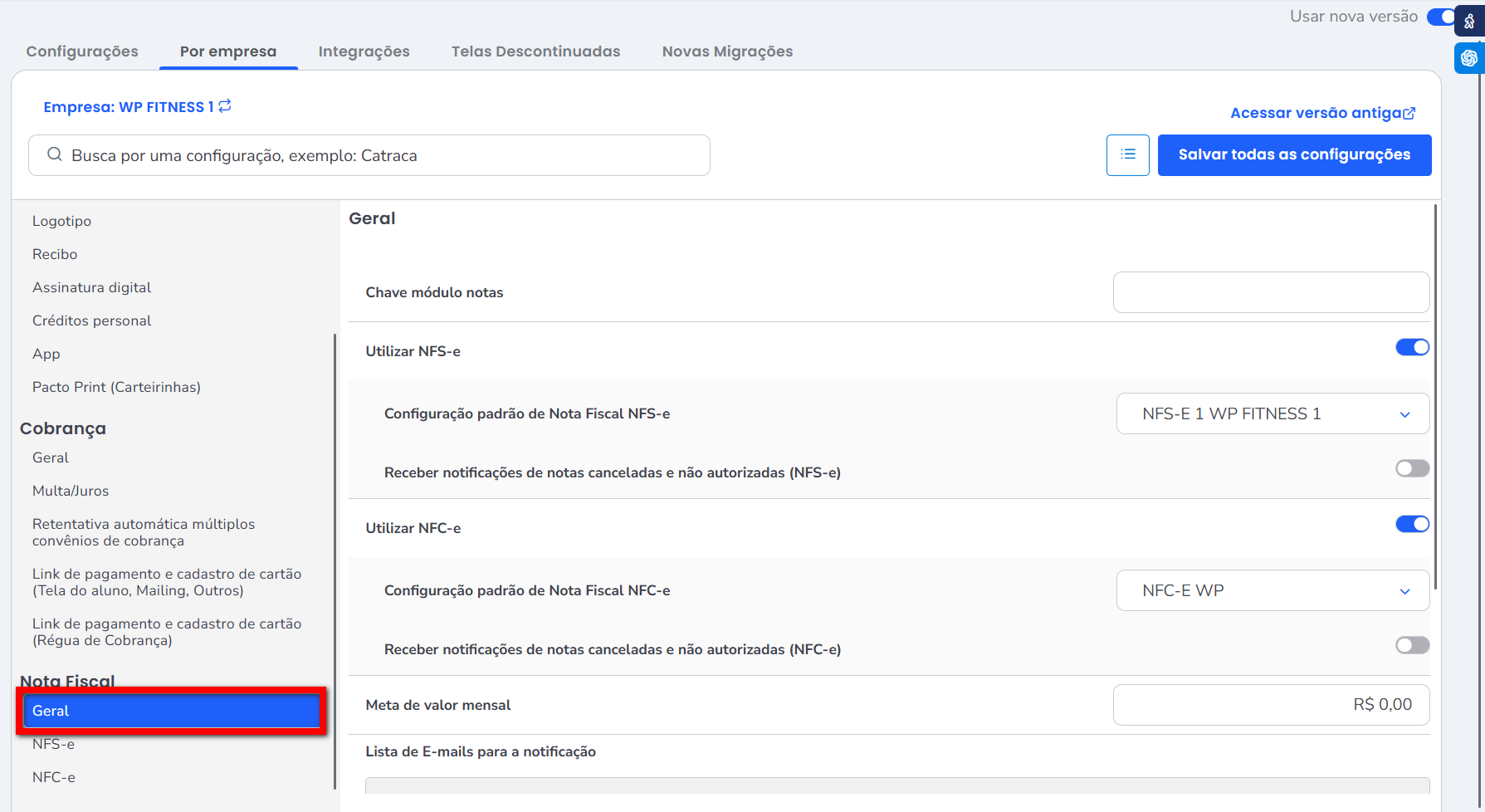 3. Em seguida, acesse a guia “Geral”, localizada no bloco “Notas Fiscal”. Nela, serão exibidas as configurações disponíveis para habilitar conforme a sua necessidade;